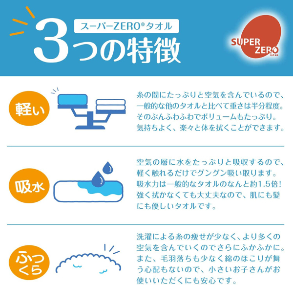 | 内 容 | ■スーパーゼロ スリムバスタオル ■サイズ:約34×125cm ■カラー:アクア ■日本製 スーパーZEROは、特殊な撚糸です。 水溶性の糸を利用した画期的な製法で繊維の間に空間ができ、 たくさんの空気を含むのが大きな特徴。 これによってふんわりしたボリュームと軽さを両立したタオルが生まれます。 糸と糸の間にある空気の層に水をたっぷりと吸収するので、 軽く触れるだけでグングンと水を吸い取ります。 その吸水力は一般的なタオルのなんと約1.5倍! 強く拭かなくても大丈夫なので、肌にも髪にも優しいタオルです。 洗濯による糸の痩せが少なく、 洗うたびにより多くの空気を含んでいくので さらにふっくらふかふかに。 また、ふっくらしているのに毛羽落ちも少なく 綿のほこりが舞う心配もないので、 小さいお子さんがお使いいただくにも安心です。 |