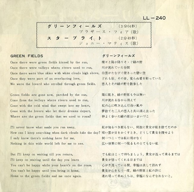 C00146793/EP/ブラザース・フォア/ジョニー・マティス「Greenfields / Starbright (1960年・LL-240)」 [浏览原始页面]