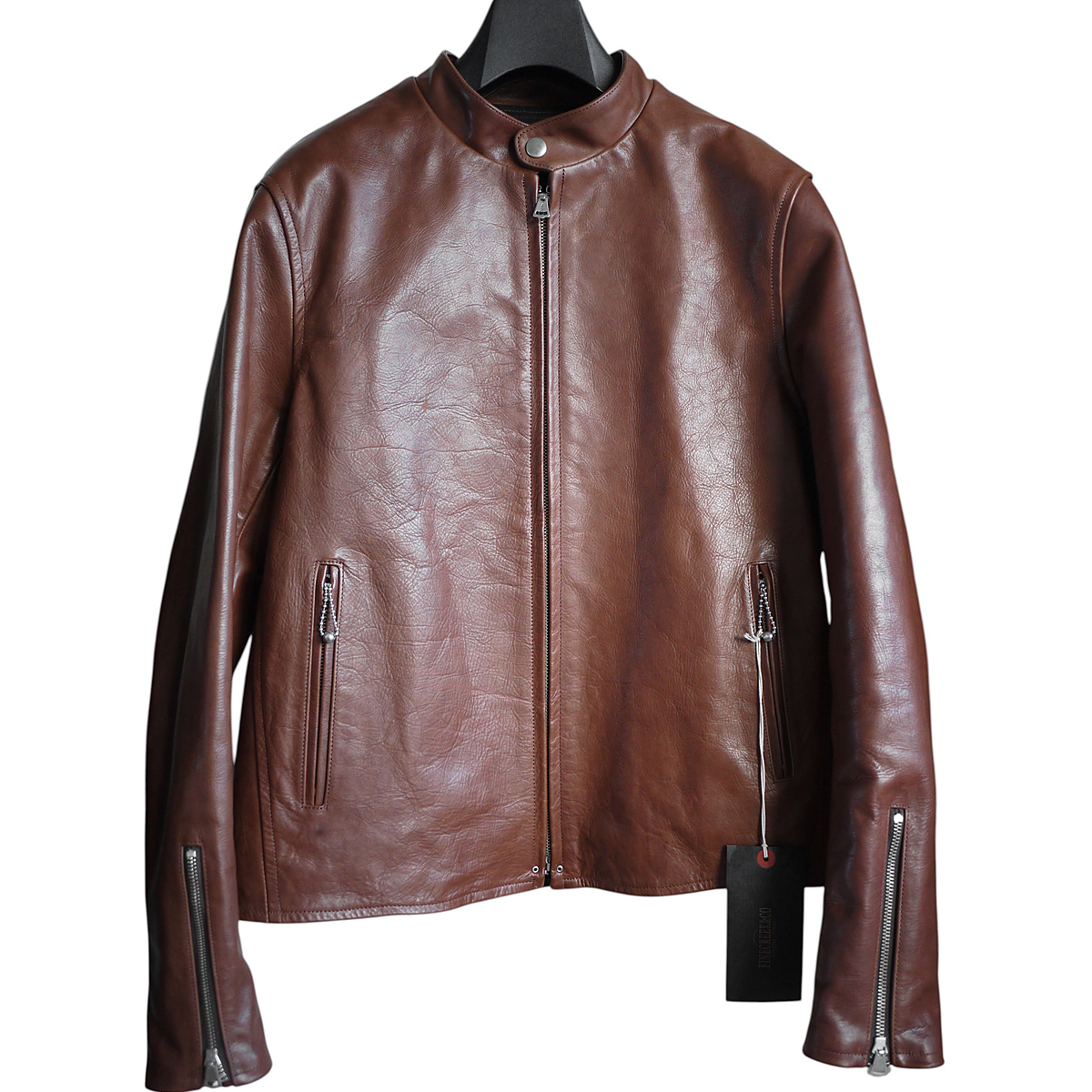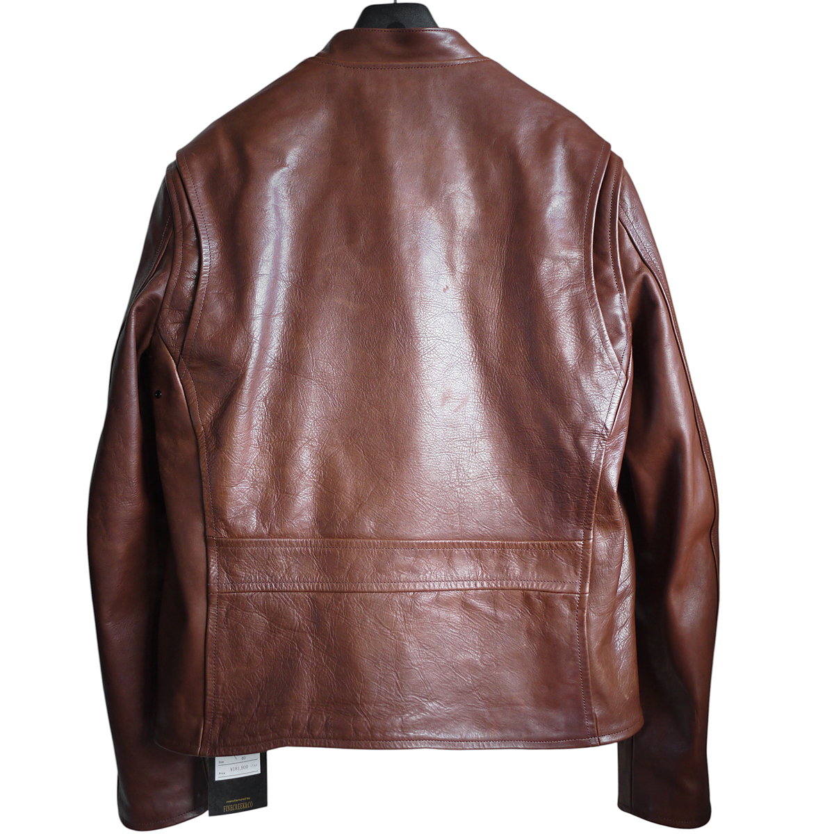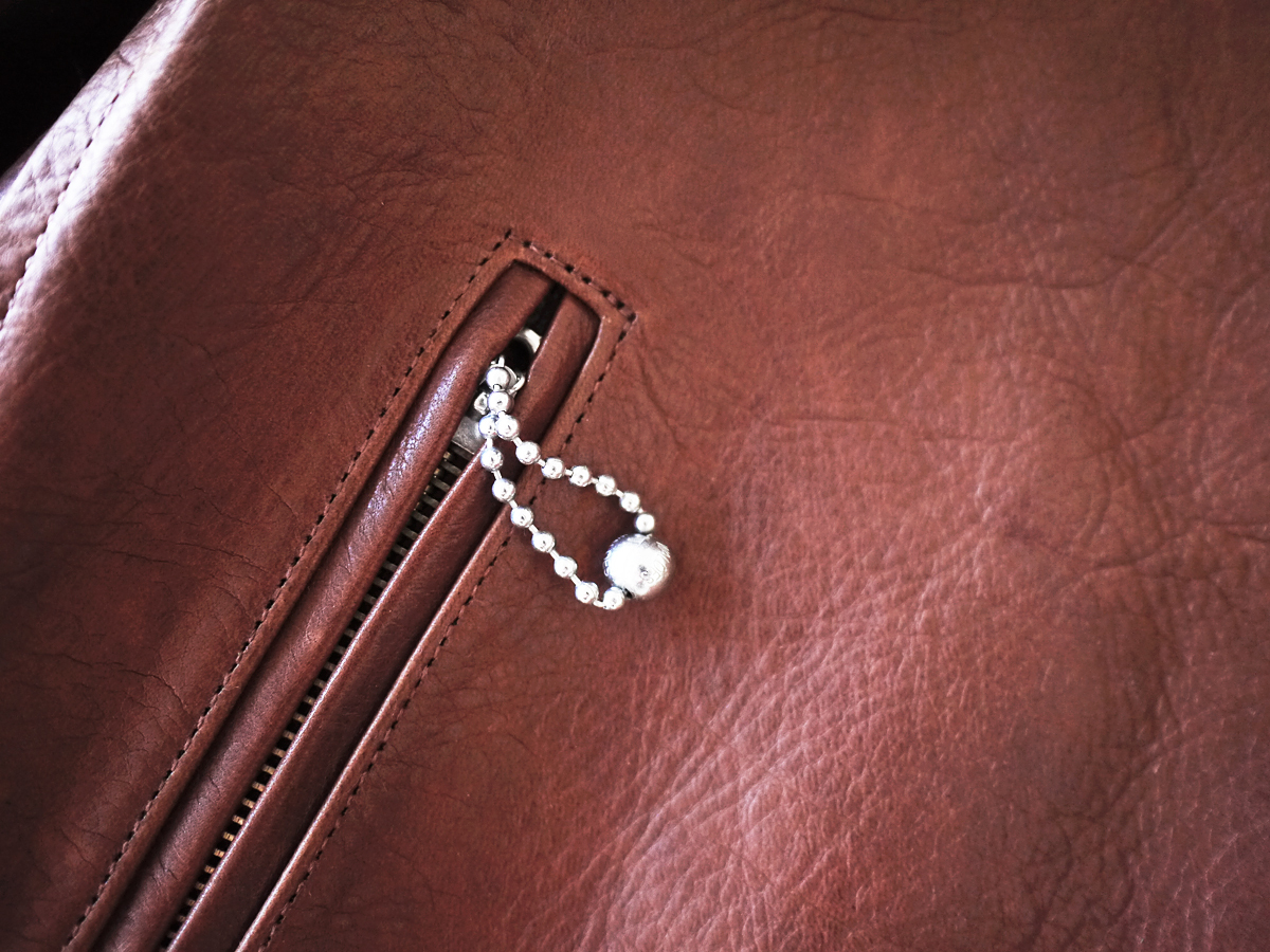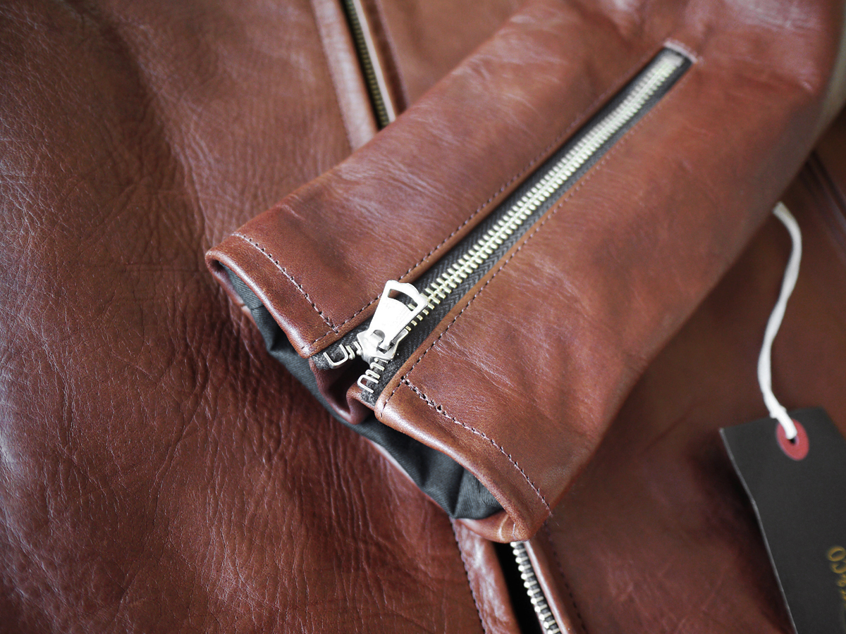 丁寧になめされた肉厚のホースレザーを採用し大変存在感のある仕上がりです。美しいブラウンカラーが重くなりがちな季節に程よく映え、これ一着で品格溢れるスタイリングを実現いたします。