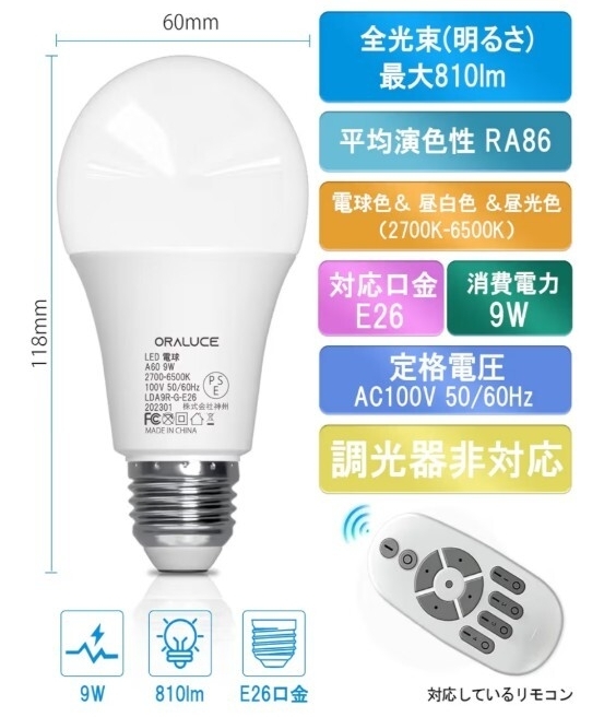 ORALUCE LED電球 E26口金 60W相当 リモコン付き 調光電球 9W 810LM 昼光色 昼白色 電球色 遠隔操作 常夜灯 広配| 出价者 | 信用 | 价格 | 时间 |