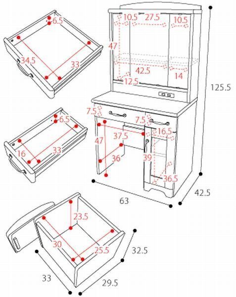 | 【カラー】 ナチュラル、ホワイト 【サイズ】 外寸 ドレッサー:幅63×奥行42.5×高さ125.5cm スツール:幅33×奥行29.5×高さ32.5cm 内寸 引出し小:幅16×奥行33×高さ6.5(有効7.5)cm 引出し大:幅34.5×奥行33×高さ6.5(有効7.5)cm ガラス扉内収納部:幅16.5×奥行36.5×高さ39cm 左ミラー扉内収納部:幅10.5×奥行12.5×高さ47cm 中央ミラー扉内収納部:幅27.5×奥行12.5×高さ47cm 右ミラー扉内収納部:幅10.5×奥行12.5×高さ47cm ガラス扉内収納部可動棚:幅19×奥行36×厚み1.5cm(3.2cmピッチ5穴) 左・中央ミラー扉内可動棚:幅42.5×奥行9×厚み1.2cm(3.2cmピッチ9穴) 右ミラー扉内可動棚:幅14×奥行9×厚み1.2cm(3.2cmピッチ9穴) スツール収納部:幅30×奥行25.5×高さ23.5cm 【材質】 本体:プリント化粧繊維板 天板・側板:塩ビ化粧繊維板 ガラス:生ガラス 【耐荷重】 左ミラー扉内可動棚:(約)2kg以下 右ミラー扉内可動棚:(約)1kg以下 扉内収納部可動棚:(約)4kg以下 作業面:(約)10kg以下 引出し大:(約)4kg以下 引出し小:(約)2kg以下 【生産国】 中国 【梱包】 2梱包でお届けします。 (2-1)サイズ:70×48×21cm、重量:17.4kg (2-2)サイズ:70×46×19.5cm、重量:25kg 【その他】 ・可動棚:大1枚、中2枚、小2枚 ・合計1500W2口コンセント付/コード長さ196cm 【組み立て品】 お客様による組み立てが必要です。 |