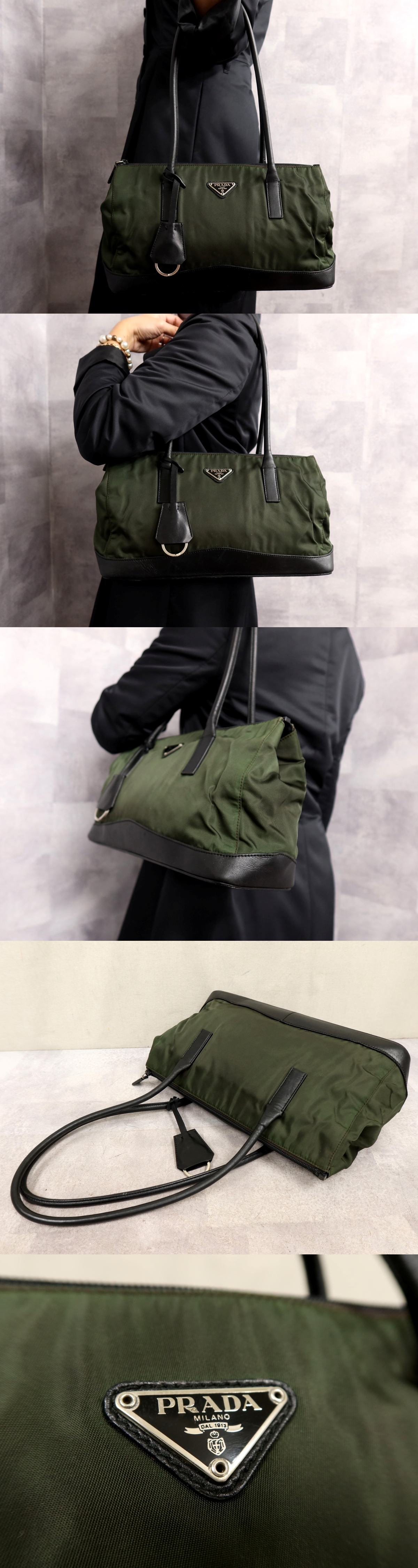 ●超美品●PRADA プラダ●三角ロゴプレート●ポコノ ナイロン カーフ レザー 本革●ショルダー トート バッグ●カーキ 黒●SV金具●Js63314 [浏览原始页面]