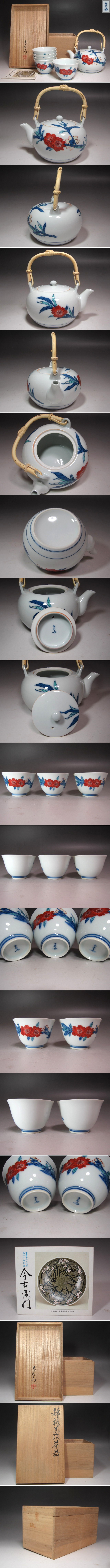 人間国宝 13代今泉今右衛門(1926~2001) 若い頃から創作的な色鍋島の制作に取り組み、現代の角度からの色鍋島に意欲を燃やした。 平成元年に重要無形文化財「色絵磁器」保持者の認定を受ける。 寸法・状態 急須:約直径17㎝×高さ18㎝ 湯呑:約直径9.4㎝×高さ6.3㎝ 若干の誤差があることをご了承下さい。 目立つ欠け・ヒビ・直し等無い状態ですが、中古品になりますのでご了承下さい。 | |||