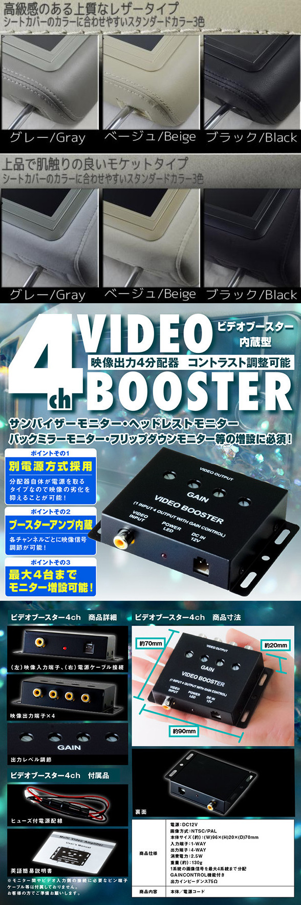 | ヘッドレスの後ろ側にモニターが付いているヘッドレスモニター左右セットです。 【4出力映像分配器】 ■商品仕様 【4出力映像分配器】 ■商品内容 【4出力映像分配器】 ■注意事項