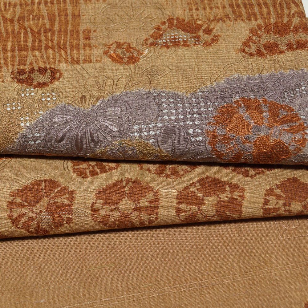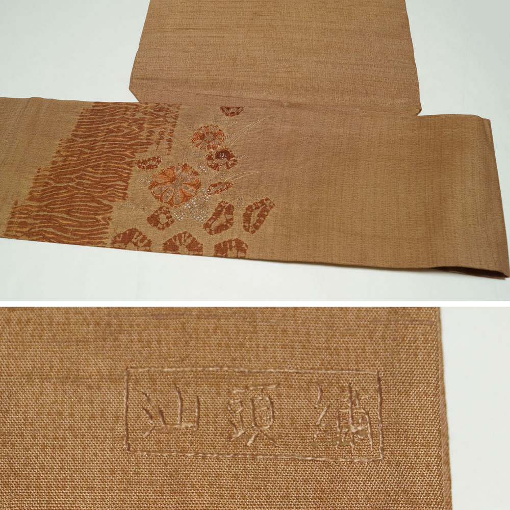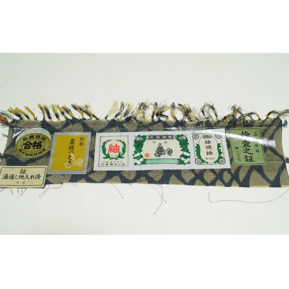| 商品説明 | 真綿の織節の有る落ち着いた墨色系の地に抹茶色系の鱗模様が織られた結城紬と、織節の有る渋めの白茶色系の地に、柿渋色系の貝絞り・板締め絞りに、スワトウ・相良・蘇州刺繍の花垣模様が施された名古屋帯の2点セットです。 お着物には本場結城紬も織られている井上商事の証紙が御座います。(本品は本結城ではありませんがとても素敵なお着物です。) 帯の垂れ先上部に汕頭繍の銘が刺繍されております。 |