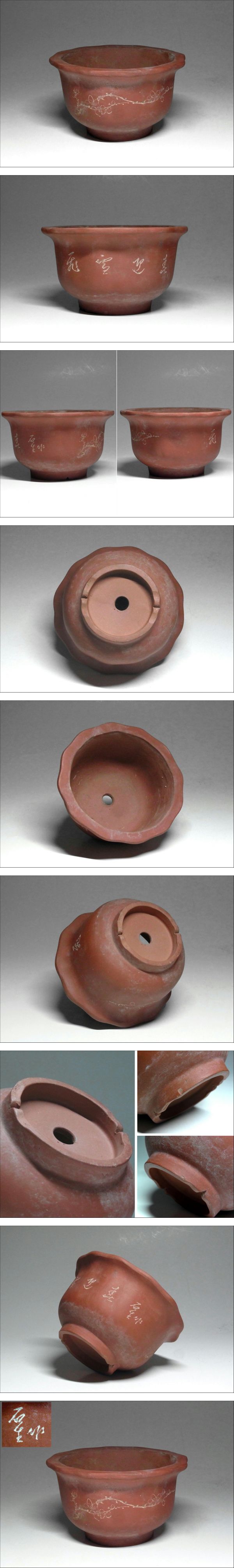 商品説明中国古玩 唐物 [石生刻]銘 梅図 漢文字釘彫 中国宜興紫砂 朱泥 輪花植木鉢 盆栽鉢です。