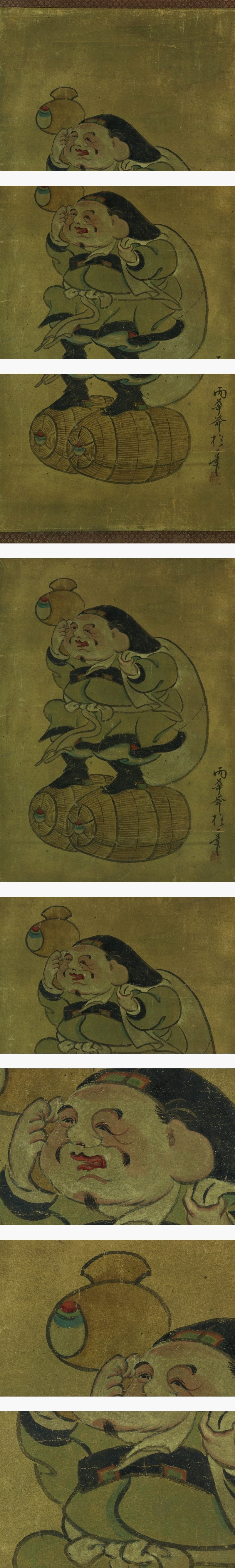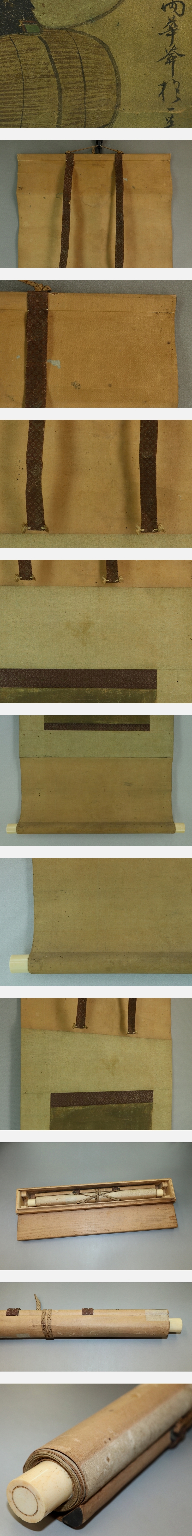 酒井抱一 さかい-ほういつ(1761-1829) 江戸時代中期-後期の画家,俳人。 宝暦11年7月1日生まれ。酒井忠仰の次男。播磨姫路藩主酒井忠以の弟。 37歳で出家し,文化6年江戸根岸に雨華庵を営む。 絵を狩野高信,宋紫石,歌川豊春に学び,のち尾形光琳に傾倒。 「夏秋草図屏風」など琳派風の絵を描いた。俳諧にも優れた。 文政11年11月29日死去。68歳。江戸出身。 名は忠因。字は暉真。通称は栄八。別号に鶯村など。 本紙は、染み、汚れ、折れ、皺、擦れ、強いヤケ、時代感があります。 表装は、染み、汚れ、折れ、皺、虫食い、破れ、ほつれ、修理痕、ヤケ、 軸先に汚れ、軸紐に劣化があります。 【サイズ】 作品 横約26cm×縦約44cm 表装 横約37.5cm×縦約123cm |