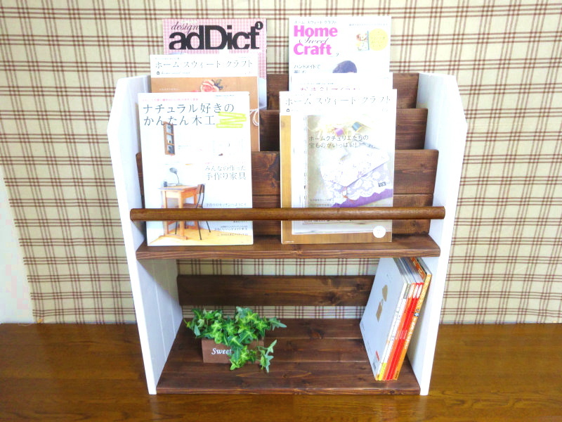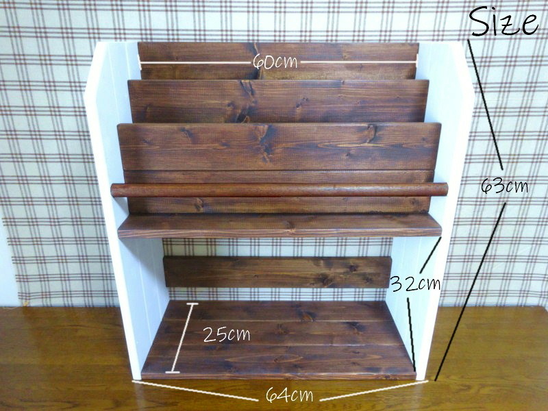 アンティーク風、カントリー風 雑誌&絵本ラックです サイズ、詳細は、 幅64cm×高さ63cm×奥行き27cm(下段の高さ32cm) ※ネジ類は全て埋め込み加工し、見えなく仕上げております。 同梱発送について。 ・申し訳ありませんが こちらの商品は同梱発送に対応できません。 ※商品ラインナップは随時変更しておりますので 在庫が無くなり次第、再出品を行わない場合があります。 | ||||