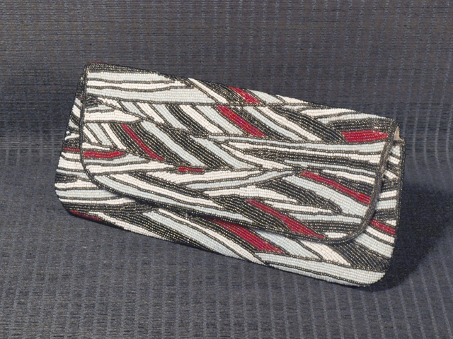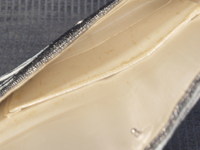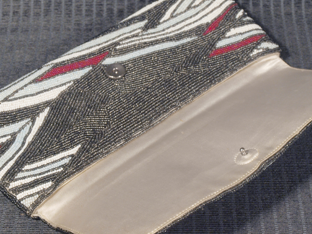 全体的な印象としては、藍海松茶(あいみるちゃ)色といった感じの地に、抽象的な文様がビーズであしらわれたクラッチバッグです。 昭和初期ごろにつくられたと思われるアンティークのお品です。昭和レトロな趣きがクールな印象です。 画像のとおり、内部の裏地に変色がところどころにありますが、そのほかに目につくしみやよごれ、褪色などのダメージはなく、この時代のものとしてはきれいな状態なので、アンティークにご理解のある方であればご使用は可能と思われます。 |