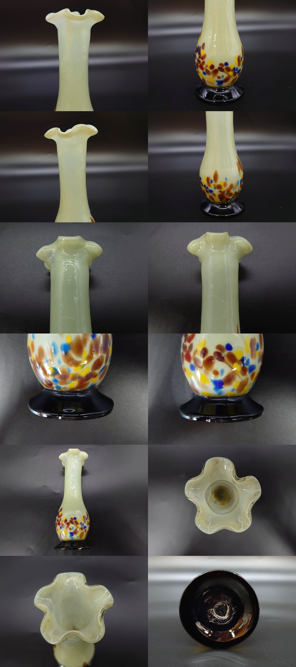 R-078238 昭和レトロ 戦前 大正 マーブルガラス花瓶2個セット(フリル、色被せ、一輪挿し、花入、花器、硝子、吹きガラス) [浏览原始页面]