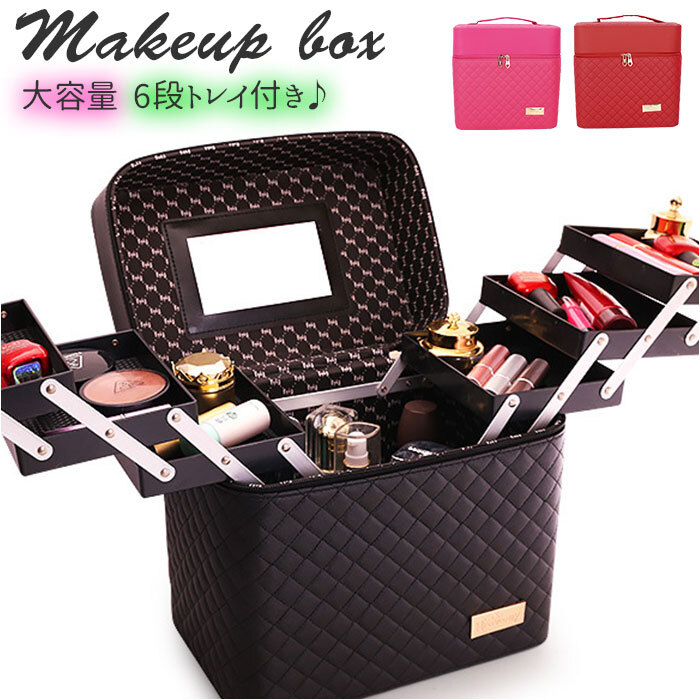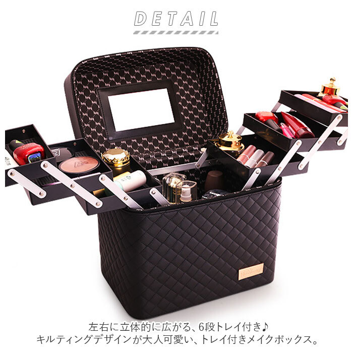 | 商品説明 | ・・左右に立体的に広がる、6段トレイ付き♪キルティングデザインが大人可愛い、トレイ付きメイクボックス。 ・メイクアップアーティスト顔負けのプロ仕様!ダブルファスナーを開放すると、両サイド各3段(全6段)のコスメ用トレーが左右にスライドオープンする収納力抜群のつくり。 ・たくさんのコスメやアクセサリーを種類ごとに分けて簡単整理!毎朝の忙しいメイク時間でもコスメのストックをサッと見渡すことができて、お目当てのアイテムがすぐに手に取れる♪ ・フタ裏には便利なミラー付きなので、一人暮らしのお部屋でも、このコスメボックスを広げればどこでもドレッサーに早変わり! ・リビングや寝室、洗面化粧台など、メイクアップがしやすい場所にラクラク持ち運びができる持ち手ハンドル付き。 ・ボックス下部にはしっかりと深さがあり、化粧水ボトルや美容クリーム、ポリッシュのようなネイル用品まで、高さのあるアイテムも立てたまま収納できる大容量設計。 ・ボックス全面にダイヤモンド型のステッチを施したキルティング調フェイクレザー仕上げ。汚れや水滴がサッと拭き取れる、お手入れのしやすさも魅力のひとつ。 |