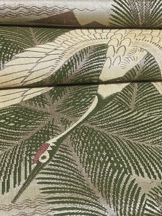 沈んだ絹鼠(きぬねず)色の地に、波と切り箔、飛鶴(ひかく)と松の文様が織り込まれている、錦織のはぎれです。 昭和初期ごろにつくられたと思われるアンティークのお品です。丸帯の解きを半分に裁断されたものと思われます。とても縁起の良い、完成度の高い意匠です。 垂れ先に無地部分が約 11.5cm あり、その部分にこまかなうっすらとした黄変がポツポツとあります。また、画像のとおり、左右のへり付近の縫い跡の山にスレが全体的にあります。そのほかに目につく大きなしみやよごれ、褪色、穴などのダメージはありません。生地の力もあります。※風楽の出品内で同じ柄のものを複数出品している場合もあります。 |