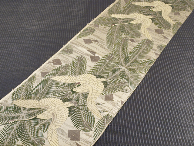 【古布】波と切箔散らしに松鶴文 錦織 丸帯 はぎれ ハギレ アンティーク 356×35 TANK06027風楽 |