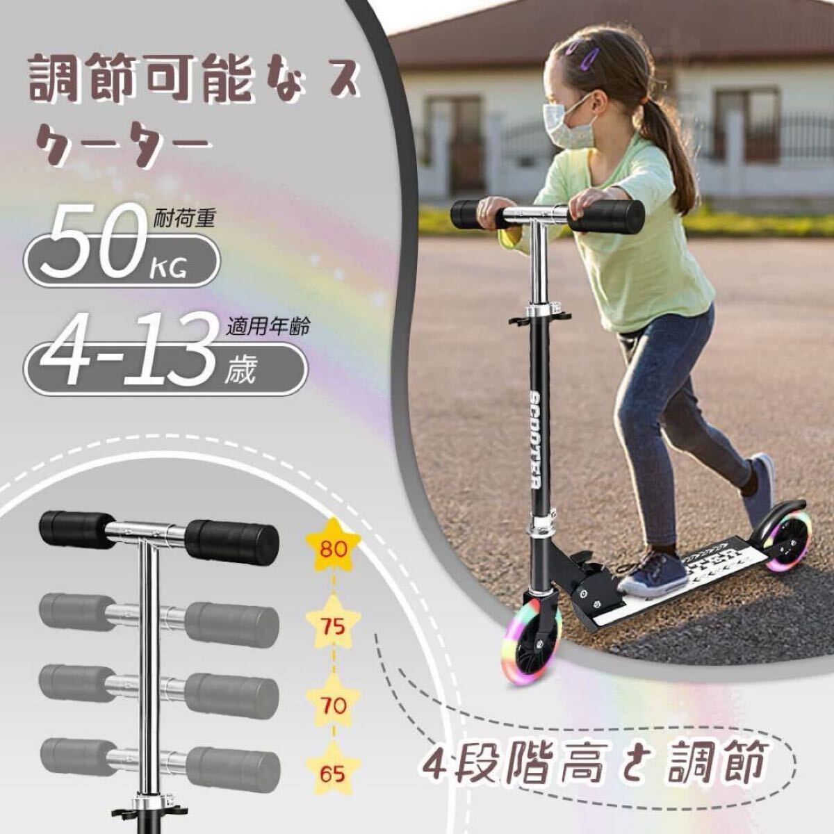 子供 キックボードの高さはお子様の身長に応じて65cm、70cm、75cm、80cmの4段階に調節できます。また、人間工学に基づいた設計に基づいており、快適で持ちやすいです。6歳から13歳までのすべての年齢層が楽しめます。