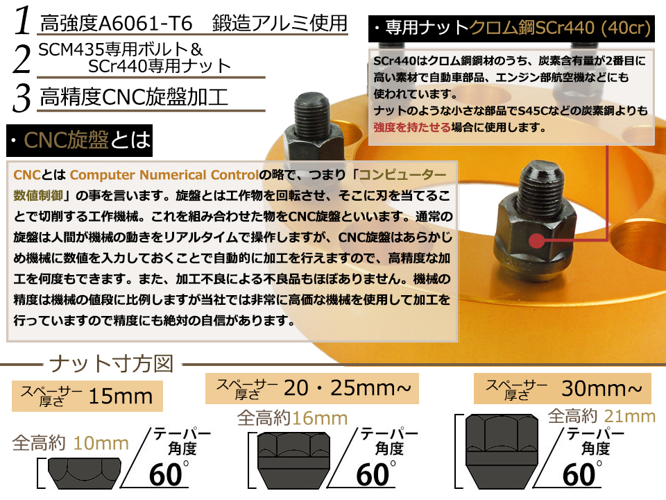 | RPGオリジナルの高強度な鍛造ワイドトレッド スペーサーです。 アルミホイールとボディのツラ合わせに必需品です。 CNC旋盤、フライス盤加工による高精度な作りとなってます。 今回ハブボルトの材質にもこだわりましてクロモリ鋼(SCM435)に変更いたしました。 クロモリ鋼は他にもクランクシャフト、フライホイール、スタビライザー、ボルト、継手、航空機脚部品、エンジン部品などにも使われておりSCM435はクロモリ鋼の中でも引っ張り強さ930N/mm2以上で比較的高めの機械的性質を持ちます。 純正品以上の強度で安心してご使用できます。 製品仕様 本体 :6穴PCD139.7 外径/176mm、内径/108mm、厚み/40mm 穴 :6穴PCD139.7 ネジピッチ :M12×1.5(トヨタ・ホンダ・マツダ・ミツビシ・ダイハツなど) 素材 :鍛造アルミA6061-T6 アルマイト仕上 ハブボルト :クロモリ鋼(SCM435) ハブボルト高さ(スペーサー端面より) スペーサー15mm→約35mm / スペーサー20mm以上→約30mm 適合車種 ランクル(60.70.80)、プラド、ハイエース、サーフ、パジェロ、デリカ等 (適合は寸法等で確認お願いします。) 使用上の注意 装着前には必ずワイヤーブラシ等でハブボルトのスレッジや汚れ、錆を取り除いてください。 電動やエアーを含むインパクト工具での締め付けは絶対に行わないでください。 一瞬でも高トルクがかかりますとワイトレのスタッドボルトのカシメ部破損、アルミナットのワレ破損が起こる場合がございます。 ご面倒でも必ず手工具+トルクレンチによる規定トルクにて締め付けをお願いいたします。 アルミホイール専用ですのでスチールホイールには使用できません。 スチールホイールですとスペーサーとの接地面が狭く、危険でございます。 ドラムブレーキ車は取付可能ですが使用しないでください。 純正スタッドボルトがスペーサーの厚みより長い場合はホイールの裏側に逃げがあるか確認してください。 スライドドアの車両に取り付ける場合は、ドアとタイヤが干渉することがあるためタイヤのはみ出しすぎにご注意ください。 装着後は約100kmを目安に適正トルクで増し締めしてください。 又、装着後はゆるみ等がないか定期的に点検してください。 こちらの商品は競技用部品です。 実際の商品は生産時期等により画像と色合いが異なることが御座います。 海外製輸入品のため少しのキズや打痕、アルマイトの乱れや汚れなどあることがございますがご了承願います。 一度取り付け,使用された商品は返品できません。 購入前に必ず専門知識のある方にサイズ等の確認をお願いいたします。 ※お買い物の際は必ず【お買い物ガイド】または、【ご利用規約】をお読みください。ご購入された時点で、同意頂いたものとします。 |