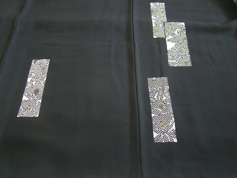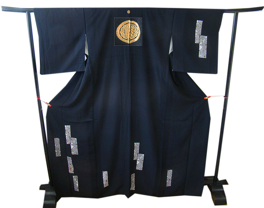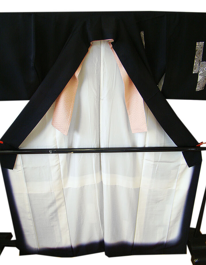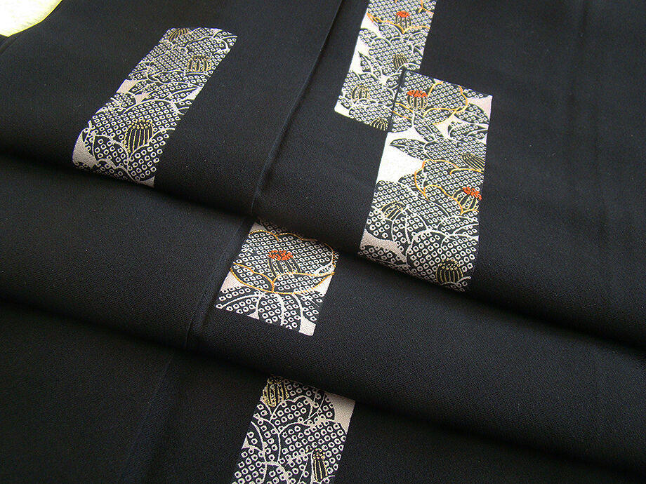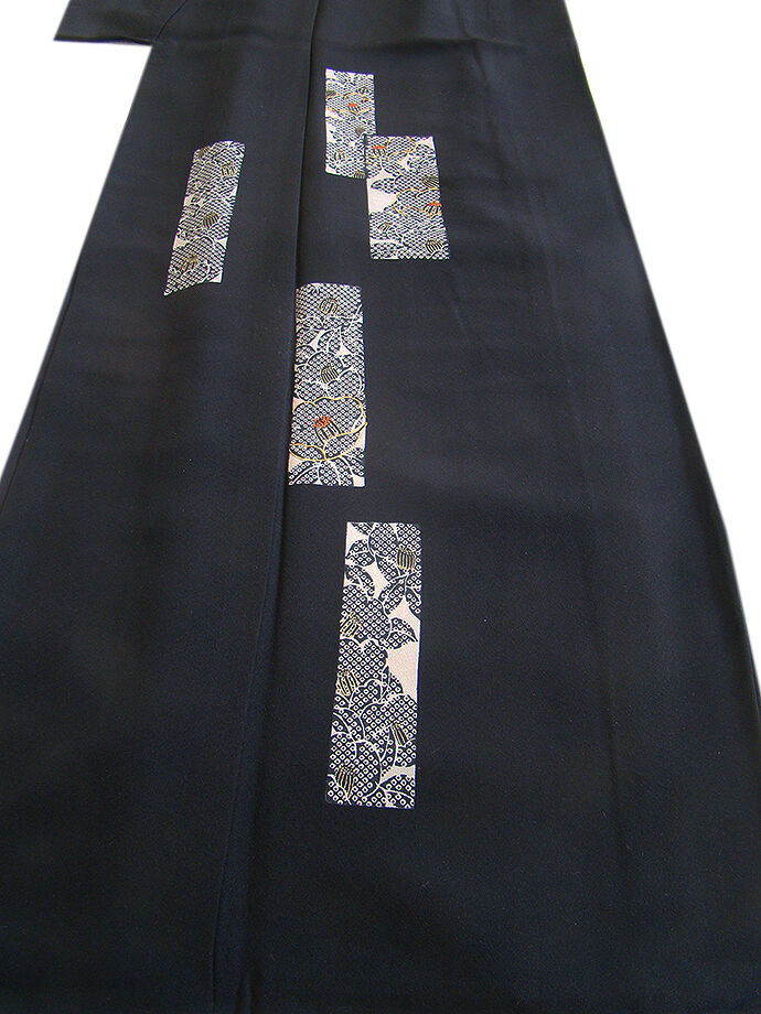 商品説明 | こちらのお品は「袷」ですので10月から5月までお召頂ければと思います。 しなやかで柔らかなさらりとした手触り良い重めの一越地の生地、 黒色地に短冊に花柄の染柄に金彩加工仕立て、 八掛は共色(正絹)、渋い珊瑚色の重ね衿付き、背に刺繍紋1ヶ入っております。 |