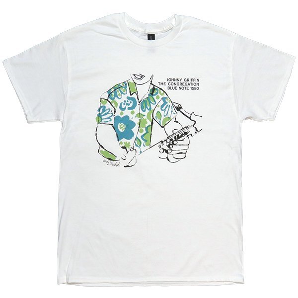 『テナーサックス奏者、Johnny Griffin(ジョニー・グリフィン)のブルーノートにおける3枚目のリーダー・アルバム『The Congregation(ザ・コングリゲーション)』 のレコード・ジャケットTシャツ。ジャケットデザインはMOMA(ニューヨーク近代美術館)殿堂入りのグラフィックデザイナー Reid Miles(リード・マイルス)で、アロハのイラストは若き日のAndy Warhol(アンディ・ウォーホル)によるモノ。グッド・デザイン!