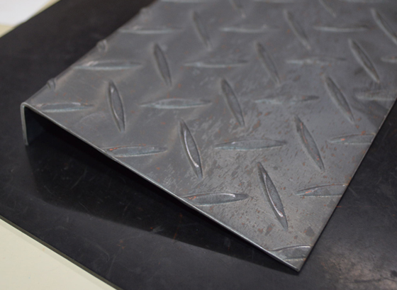 鉄縞鋼板(黒皮)のL字曲げ製作品。不等辺アングル、角部補強カバーを