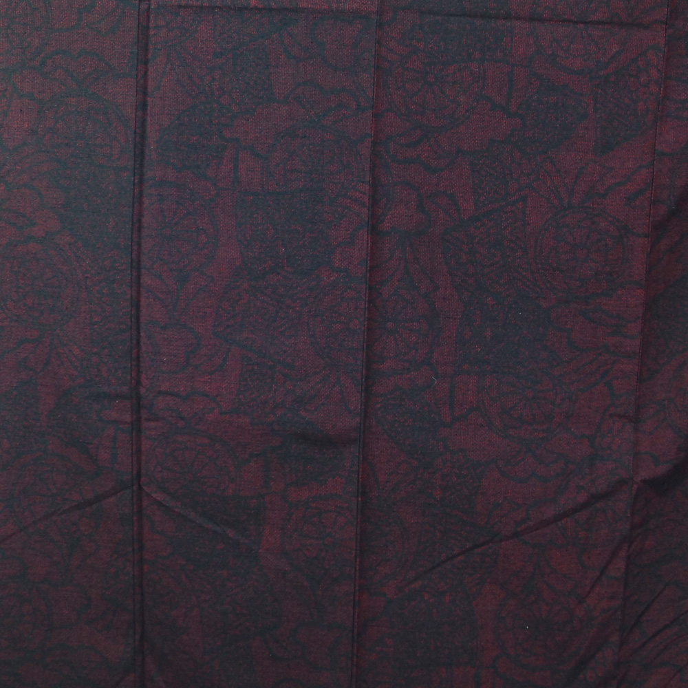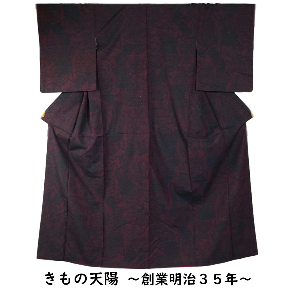 商品名 | 紬 源氏車に几帳模様 Mサイズ 小田急扱い 黒・赤紅色系 【紬 中古 紬 着物 tsumugi 紬 リサイクル着物 着物 中古 正絹 リユース 紬 紬着物 リサイクル着物 】 | ||