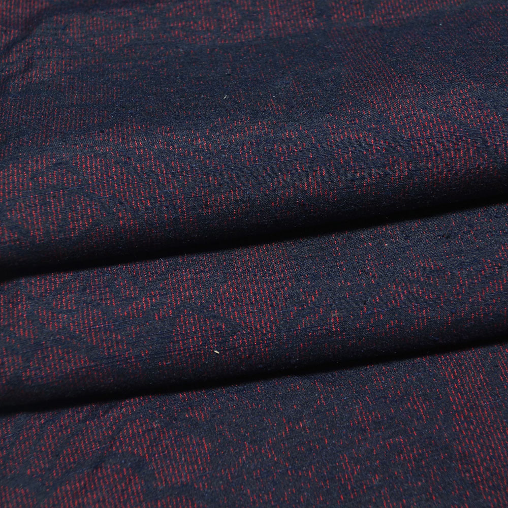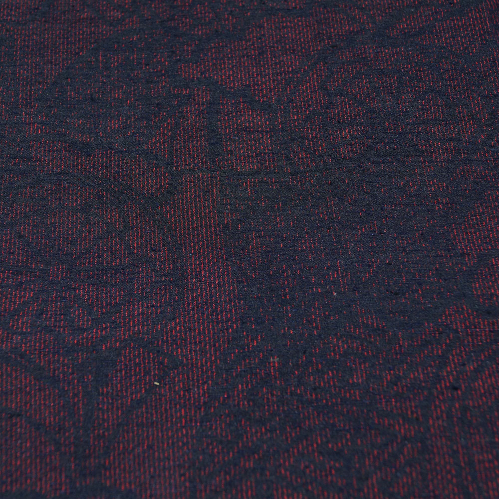 商品説明 | 黒色系の真綿の地に赤紅色系の源氏車に几帳模様が織られた紬です。 小田急扱い、タグも付いております。 | ||