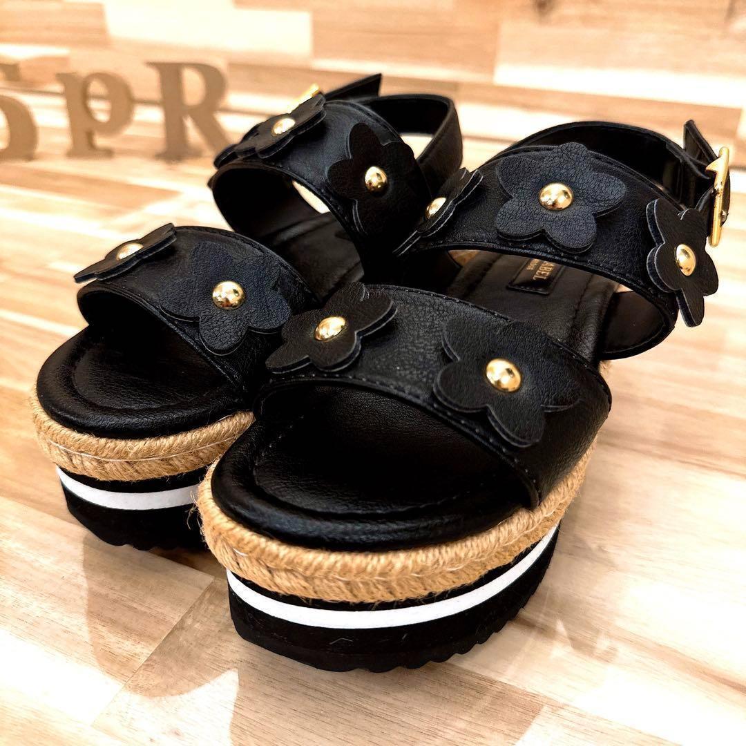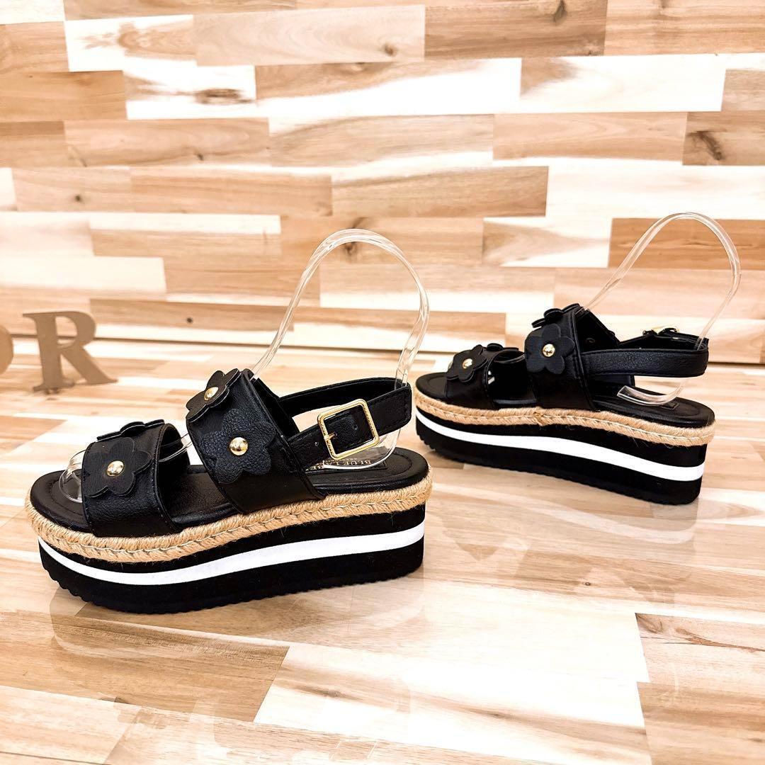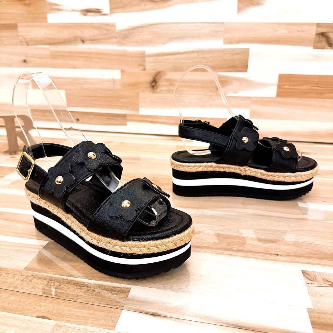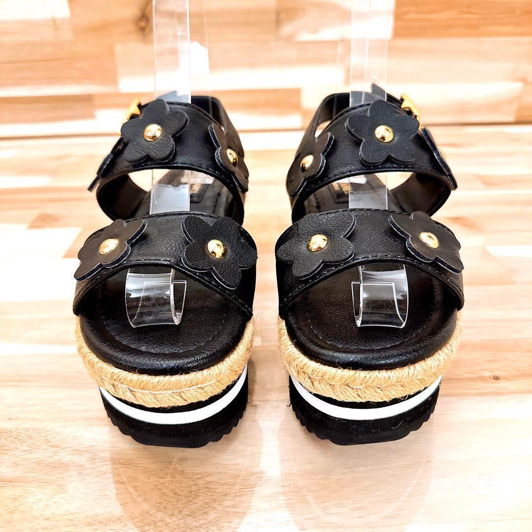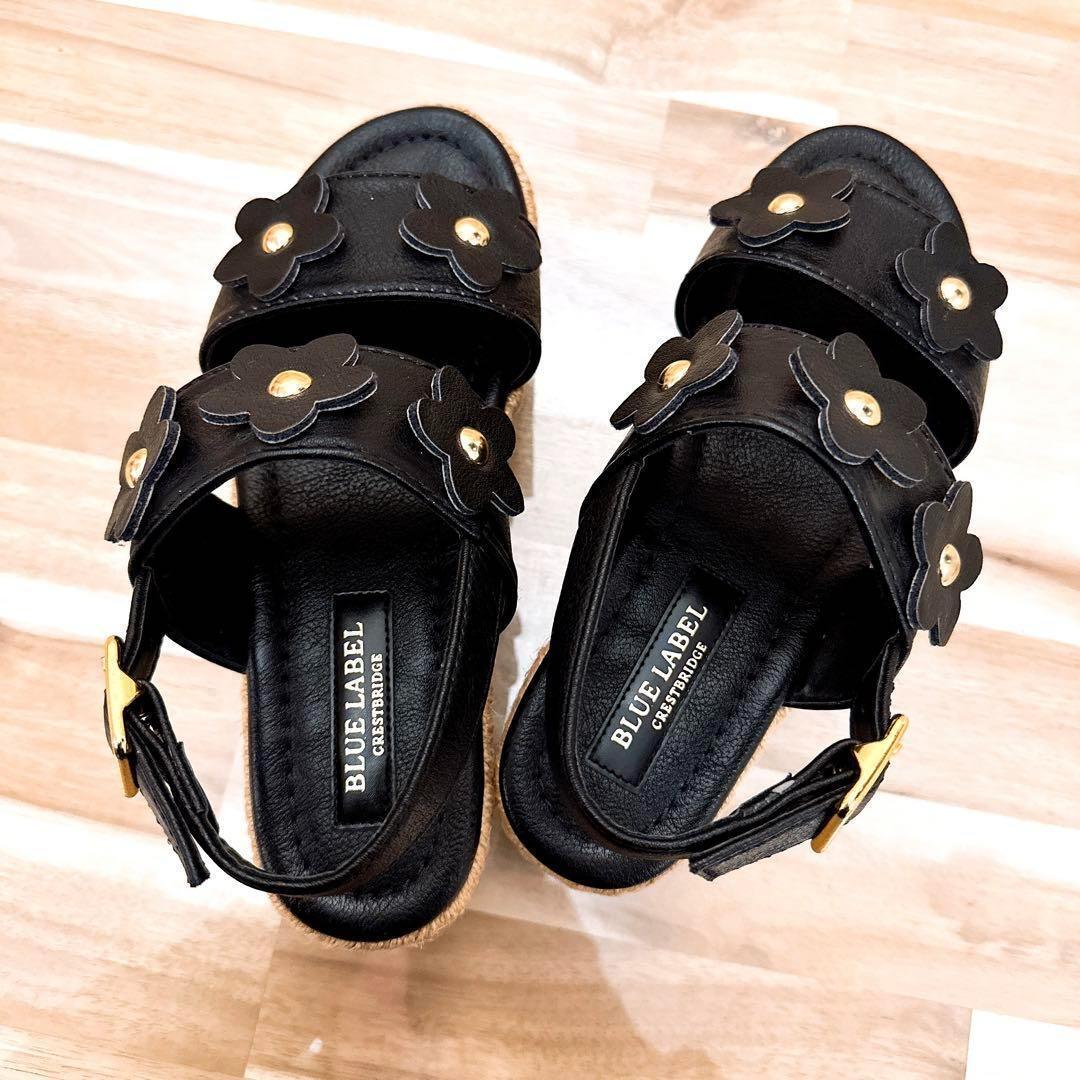 ブラックベースに映えるフラワーモチーフが愛らしいアクセント。ほどよいツヤ感のアッパーに、モノトーンのラインが映えるソールが軽やかな抜け感をプラス。足元にインパクトを添えながらも、安定感のある厚底デザインで歩きやすさも◎。シンプルなデニムやワイドパンツとの相性も抜群。デイリーでお使いいただけるBLUE LABEL CRESTBRIDGEのサンダルです。足元を華やかにワンランクあげてくれるおすすめの一側です。※脱臭機にて除菌リフレッシュ済みです。