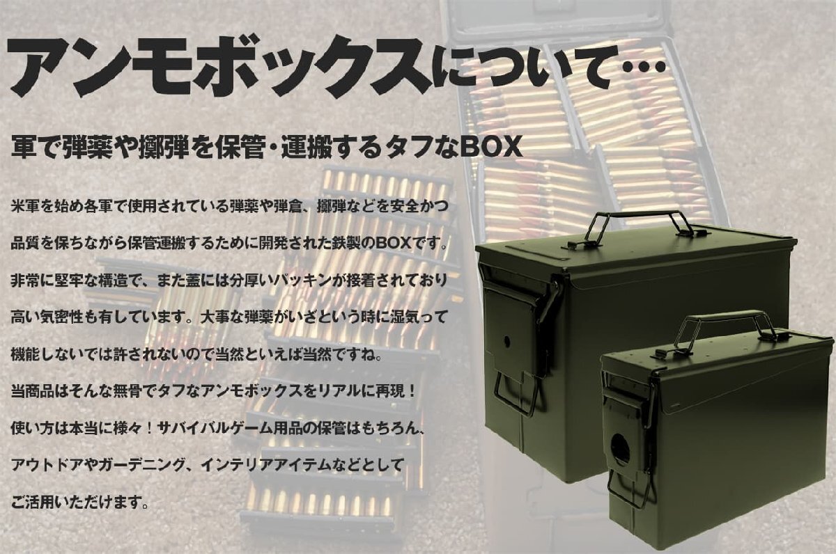 商品説明 ITEM INFO 7.62mm用弾薬ケースをリアルに再現!バッテリーや工具・アウトドア用品の収納に!密閉性が高いので炭入れにもオススメ! MILITARY-BASE(ミリタリーベース)M19A1タイプ 7.62 アンモボックス 2個セットです。 米軍でM60マシンガンなどの7.62mmベルトカートリッジを運搬・保管するのに用いられたボックスをリアルに再現しています! 蓋にはパッキンが内蔵されているのである程度の密閉性があります。防滴&防塵ケースとしてや乾燥剤を同梱しての防湿ケースとしてもオススメです。スコープやドットサイト、モデルガンの火薬等などのミリタリーアイテムから、キャンプ道具や木炭などのアウトドアグッズの保管・運搬にピッタリ。 また防火性も高いのでリチウムバッテリーの保管にも使用できます。 ミリタリーな雰囲気が全開なので、お部屋や店舗、ガレージ、トランポなどのインテリアグッズとしてもどうぞ! 商品基本情報・スペック ITEM SPEC ●商品名 : MILITARY-BASE(ミリタリーベース)M19A1タイプ 7.62 アンモボックス 2個セット ●商品番号 : H8012BM19-2PC ●カラー : BK(ブラック) ●素材 : スチール ●サイズ : 275mm×96mm×182mm ●重さ : 1.8kg ●オススメの用途 : エアガンのBB弾やマガジンの保管アーモボックス、耐火容器としてリチウムバッテリーの保管・運搬箱、DIY用品や自転車・バイク・車の工具を収納するツールボックス、密閉性を活かした炭入れやカメラのレンズ保管箱、インダストリアルなインテリアアイテム、オートバイのパニアケースなどなど 注意事項 ITEM NOTE ∇商品固有の注意事項 ※表面に多少の小傷や小さな凹み、塗装ムラがある場合ございます。 ※気密性向上のため、ロックは硬めになっています。開閉の際は手を挟まないようにご注意ください。 ∇ご購入時の留意事項 ※商品はすべて点検してからのお届けになります。商品によってはパッケージの開封等を行う場合もございますことをご了承ください。 ※商品には万全を記しておりますが、万一不備な点がございましたら、お手数ですがお問い合わせフォームにてご連絡頂ますようお願い致します。なお、海外製品につきましては、輸入時についた若干の傷、痛み等が見られる場合がございます。 国内製品のような完全品をお求めの方はご遠慮下さい。 ※商品が適合外であった場合、またはお客様都合による交換・返品・返金は出来ません。よくお確かめの上、ご購入下さい。 ※モニター環境により、実際の商品の色と若干異なる場合がございますのでご了承下さい。 ※他サイトでも同時販売の為売り切れの際はご了承下さい。 ※売り切れの際は早急にご連絡させて頂きます。(当社休業日を除く) 関連商品 RELATED ITEM |