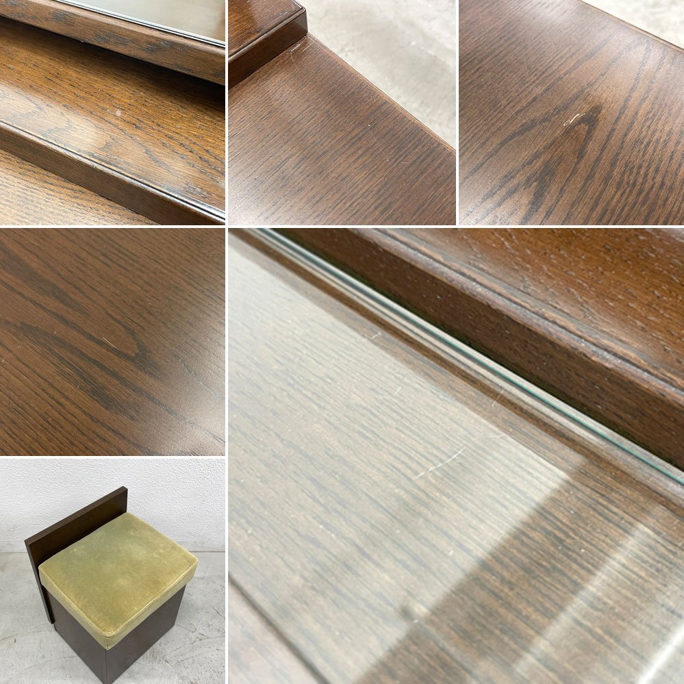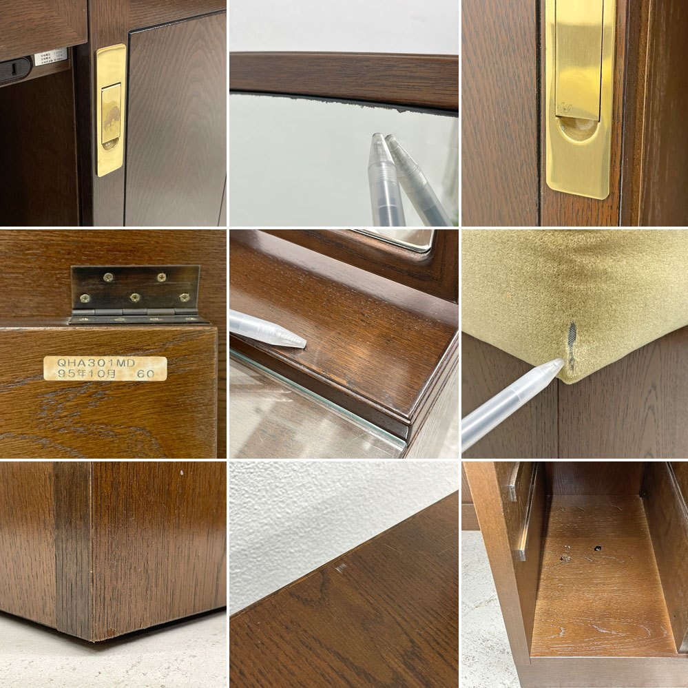 | コンディション | ガラス天板に僅かな線傷がございます。木天板に取り切れない汚れや小傷、シミが散見されます。金属把手は線傷、経年による腐食が生じております。スツールのベース部分の突板に一部剥がれ、ファブリックに摩耗によるダメージ、使用に伴う変色がございます。鏡面の縁に経年による腐食が生じております。抽斗奥に一カ所取り切れない汚れがございます。 使用感のあるお品ではございますが、コンセントの故障や開閉不良、ガタつきなどの使用に問題のあるダメージは見られず、中古品としましては今後も長くお使い頂ける良好なコンディションです。 ※特筆すべきコンディションは出来るだけ記載させて頂きますが、細かい擦れや傷、汚れ等を完全にお伝えする事は出来ません。画像をご確認の上、ご入札をご検討下さいませ。 ※取扱説明書や保証書等は記載が無い限り付属いたしません。 |