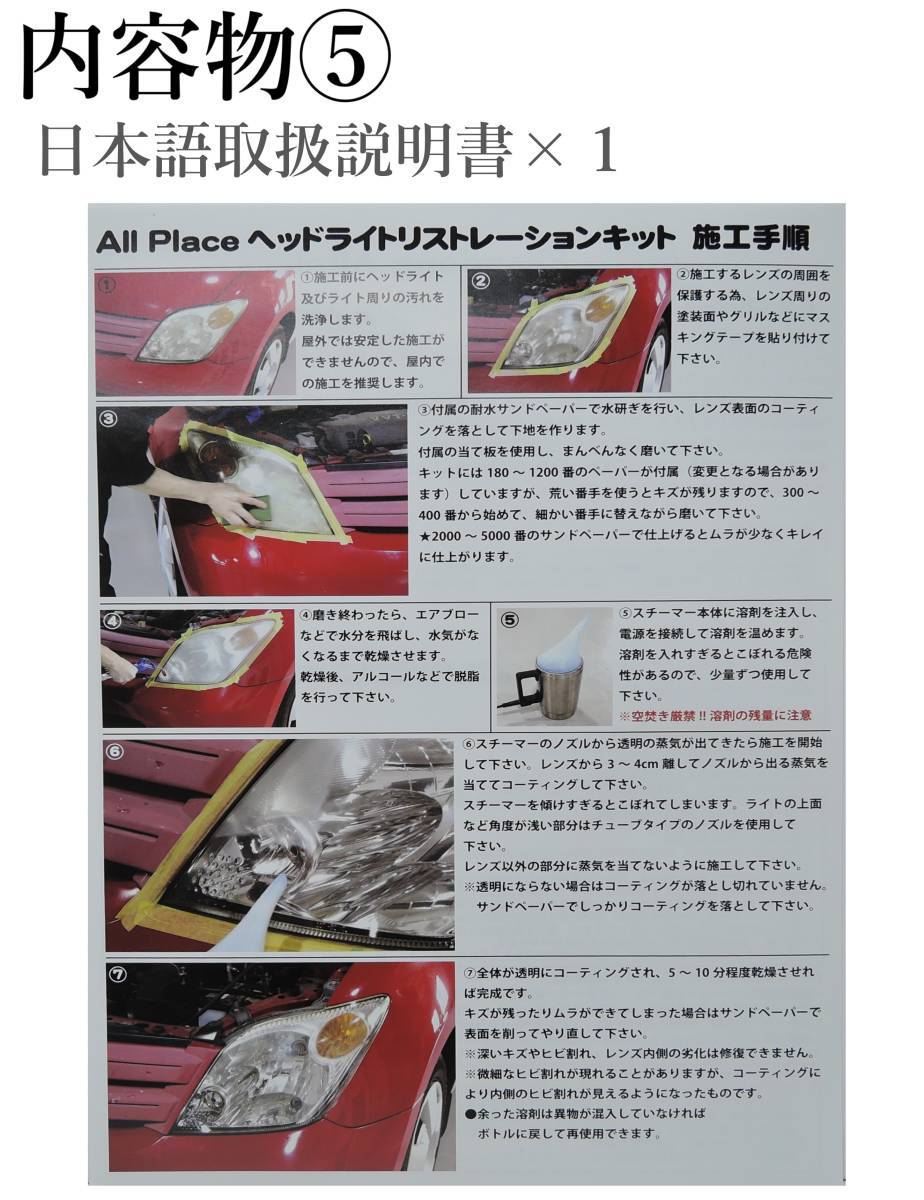 ヘッドライトスチーマー 格安施工キット 溶剤なし ■商品概要: すでにコーティングリキッドをお持ちの方に収納ケースを省いた施工に 最低限必要なものだけいれた大変お買い得なヘッドライトスチーマーキット です。 届いてすぐに施工がスムーズにできる日本語取扱説明書付き! くすんで黄ばんでしまったヘッドライトが見違えるように綺麗になります。 簡単、お手軽にヘッドライトの黄ばみやくすみ、曇りをリフレッシュし新車の輝き。 ※当セットは100V電源アダプターで使用する商品となります。 12Vシガー電源ケーブルは付属しておりませんので、車から電源を取りたい際は別途ヘッドライトスチーマー用の シガー電源ケーブルをご購入ください。 ヘッドランプリムーバー正規代理店 ※ヘッドランプリムーバー正規代理店として認可されています。 ■内容: ・加熱蒸散用スチーマー本体×1 ・スチーマー本体用AC100電源アダプター×1 ・スチーマー用ノズル×2種類 ・ノズル用パッキン×2 ・溶剤移し替え用漏斗×1 ・水研ぎサンドペーパー用当て板(ウレタン製)×1 ・マスキングテープ×1 ・水研ぎサンドペーパー×6枚(#180~#1200) ・日本語取扱説明書×1 ■施工方法 1.ヘッドライトの周辺をマスキングテープで養生します。 2.耐水ペーパーでヘッドライトの表面を研磨し、くすみ・黄ばみを除去。 3.綺麗なタオルでふき取り、脱脂後乾燥させます。 4.ヘッドランプリムーバーの本体に溶剤を約1cm入れ、リムーバー本体の電源を入れる。 5.5分程でリムーバーの先端部分から蒸気が出てくるのでてきます。 ヘッドライトからノズルを2~3cm程離して蒸気をまんべんなく当ててください。 6.ヘッドライトに蒸気を当てていくとツヤ感が出てきます。綺麗にクリアになれば完成!! ■注意点 セット内容は写真に写っている物が全てです。 ※その他付属品は一切ございません。 ・食品ではありません。誤飲を防ぐため、置き場所・取り扱いにご注意ください。 ・火や火気の近くで使用しないでください。 ・液が目に入ったら、すぐ水で洗い流してください。 ・画像はお使いのモニターにより色合いが変わることがございます。 ・ロットにより、色・デザイン等若干変更される場合がございます。 ・マスクは現在お付けしておりません。あらかじめご了承ください。 | ||||