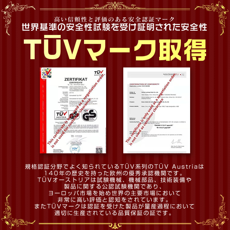 ■保障期間 30日間 ※商品到着後30日以内の初期不良・破損のみご対応させていただきます。 ■注意事項 ※タイヤチェーンは、タイヤサイズに適合するサイズのものを装着してください。 ※車輌重量2.0t未満の車両にてご使用ください。 ※メーカー・銘柄・夏用タイヤ・冬用タイヤ等で大きさが異なり装着できない場合がございます。詳しくは販売ディーラーにて確認して下さい。 ※ハンドルをいっぱいに切った状態でタイヤとタイヤハウスおよびタイヤとサスの間隔が3cm以上あることを確認しご使用ください。 ※タイヤ内側と車両の間隔が狭い一部車種・タイヤサイズにてご使用いただけない場合がございます。(特に車高を下げている場合はご注意下さい) ※タイヤ空気圧が不足している状態での装着はお止め下さい。 ※取付け・取外しは安全は場所で行ってください。 ※増し締めは、必ず行ってください。 ※時速40Km以内でご使用ください。 ※急加速・急減速・急旋回を行わないでください。 ※装着したまま積雪路・凍結路以外を走行しないでください。(タイヤ・チェーン・車両の損傷やスリップの原因となります) ※商品は、モニターによって色合いが異なって見える場合があります。 ※仕様・デザインは改良のため予告なく変更することがあります。 【もちろん新品未使用品です】 | ||