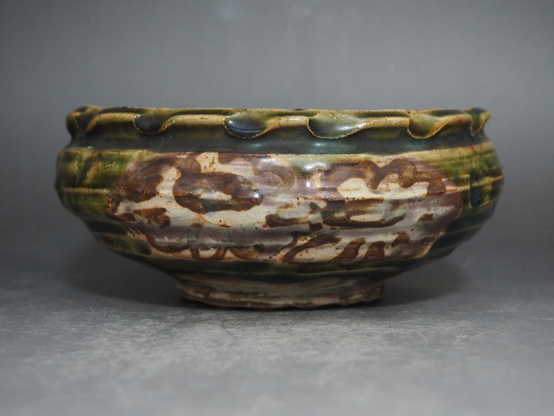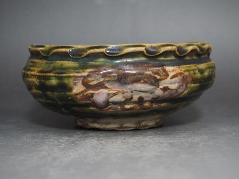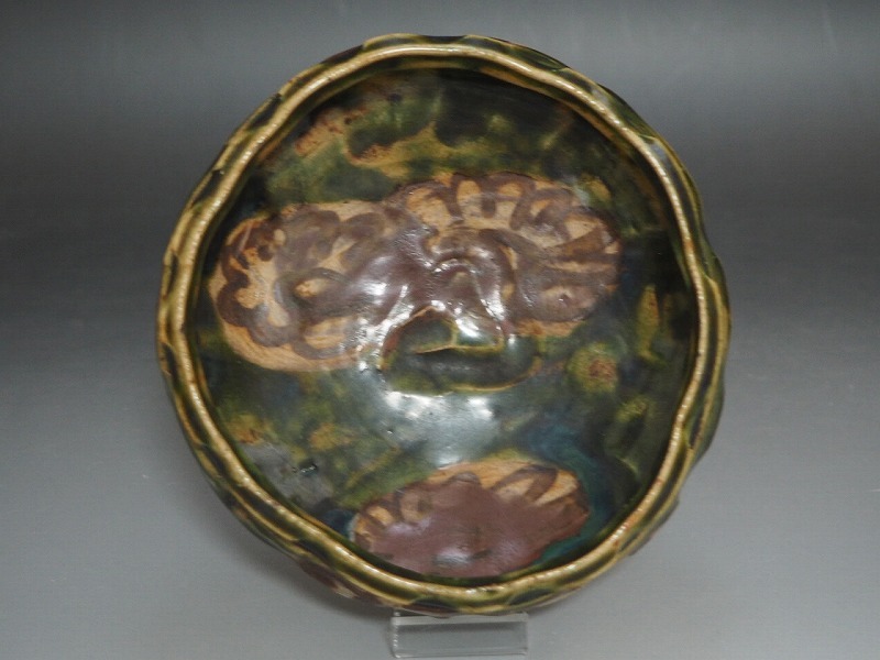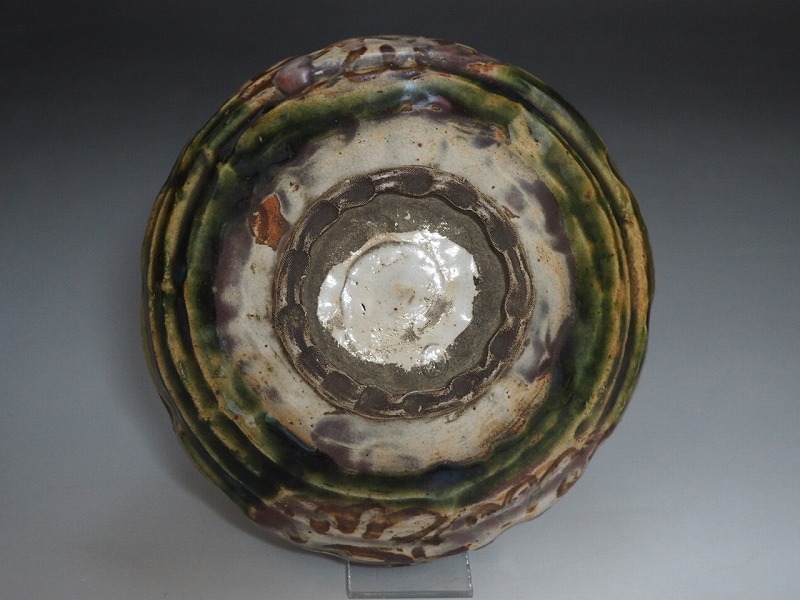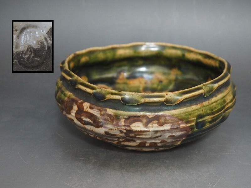| A4485 織部焼 加藤作助 作 時代 菊花文 向付 ☆ 茶懐石 茶事 懐石道具 会席道具 茶道具 小鉢 作家物 在銘 陶印 古美術 骨董 古い 旧家蔵出 | ||