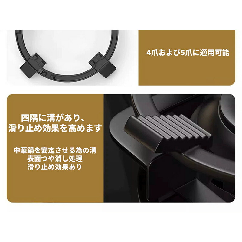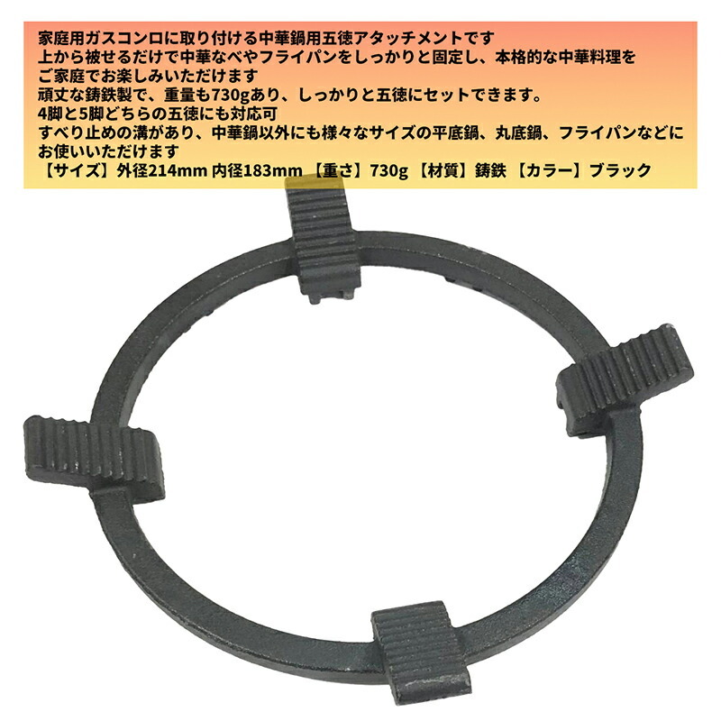 家庭用ガスコンロに取り付ける中華鍋用五徳アタッチメントです上から被せるだけで中華なべやフライパンをしっかりと固定し、本格的な中華料理をご家庭でお楽しみいただけます