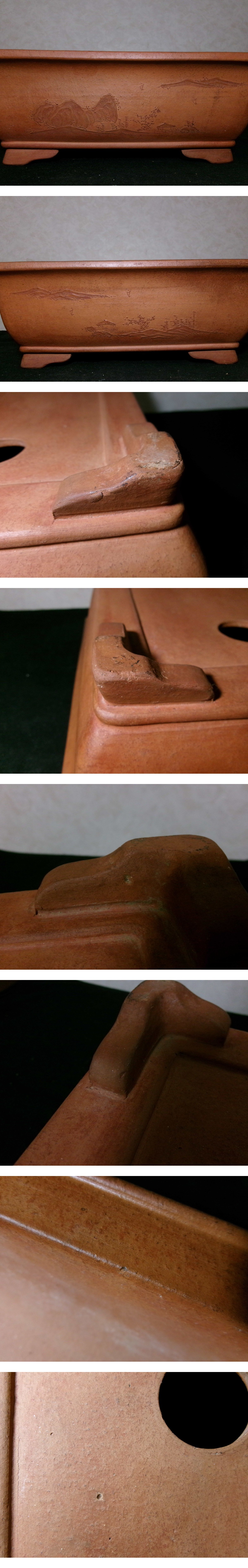 希少 時代感上々 見事な土目と丁寧な造形 中国古鉢 中国宜興 朱泥山水画浮絵段足下帯外縁長方鉢 幅32センチ 在銘 中国古盆器写 時代品 | |||||||||||