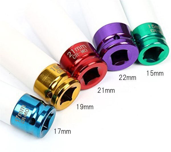 | 商品詳細 | 特 徴:インパクトレンチに対応の自動車ホイールナットの締め、緩めに使用する専用ソケットレンチ。 プラスチックカバー付きなので、アルミホイールにキズ付きにくい。 サイズが一見で分かるよう、色分けされています。 ■商品仕様 ・差込角 : 1/2"(12.7s.q.) ・全 長 : 83mm ・サイズ : 15mm、17mm、19mm、21mm、22mm ・外 径 : 23.5mm、23.5mm、25.5mm、27.5mm、29.5mm(カバーなし) ・ソケット材質 : クロームモリブデン ・樹脂カバー : PVC ・セット重量 : 1.2kg ※仕入時期によってケース色が変わる場合があります。 |