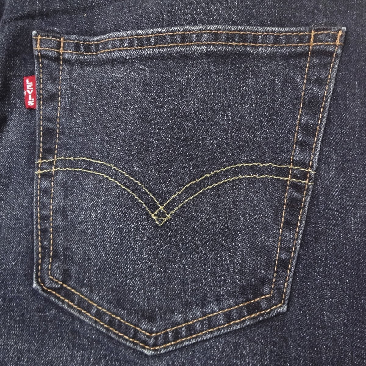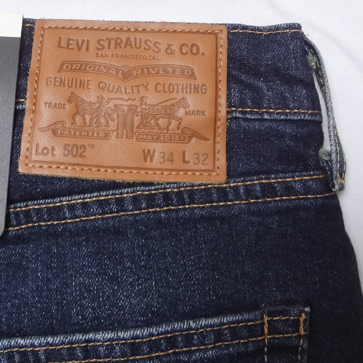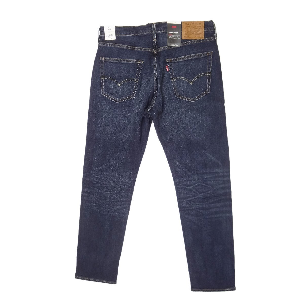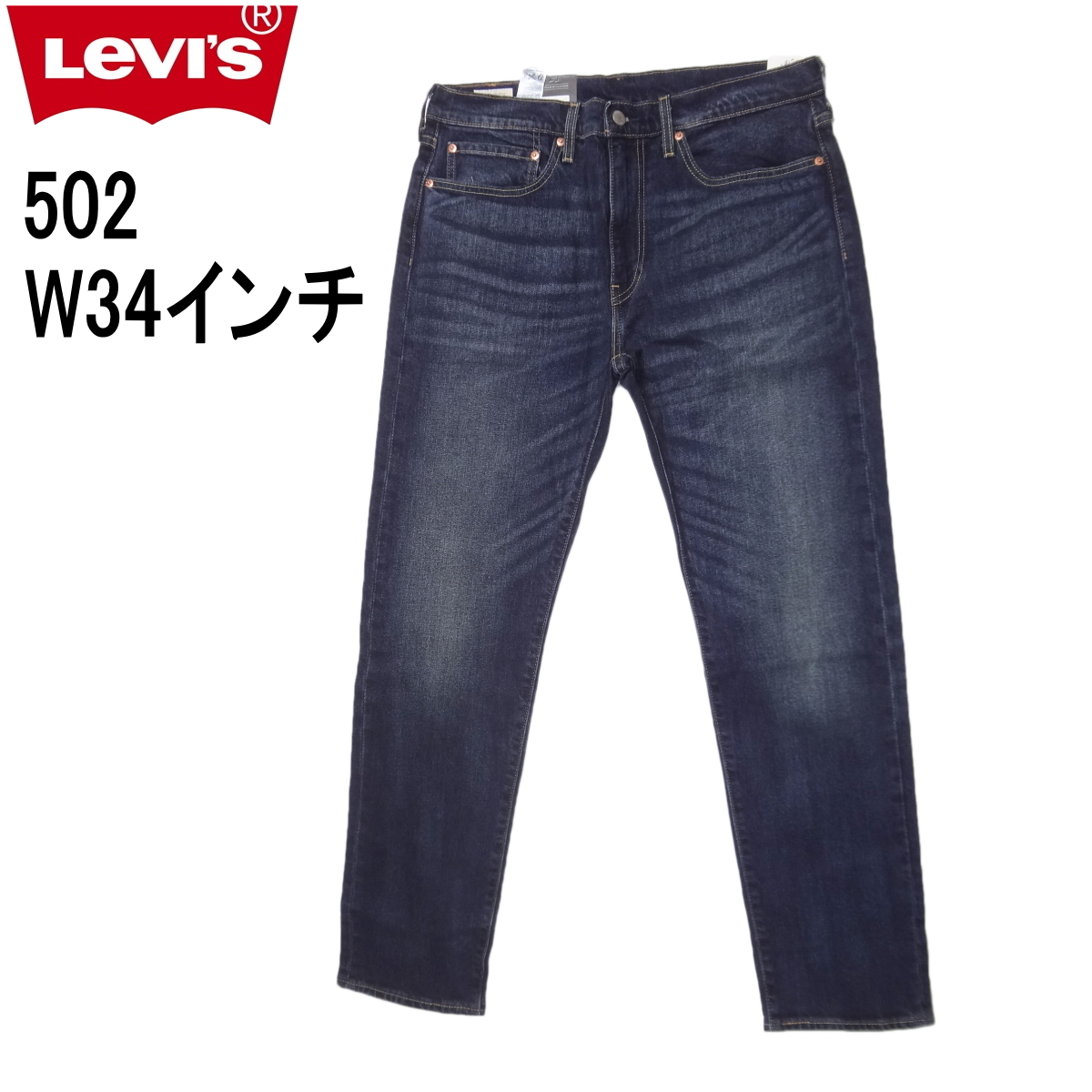 リーバイスの502ストレッチデニムジーンズ、素材/綿99%ポリウレタン1%、パッチ牛革、ダークインディゴブルー、ダメージジーンズユーズド加工