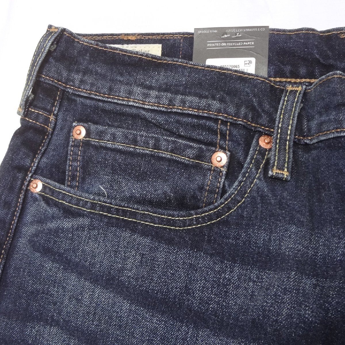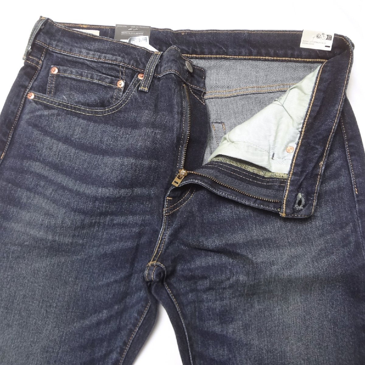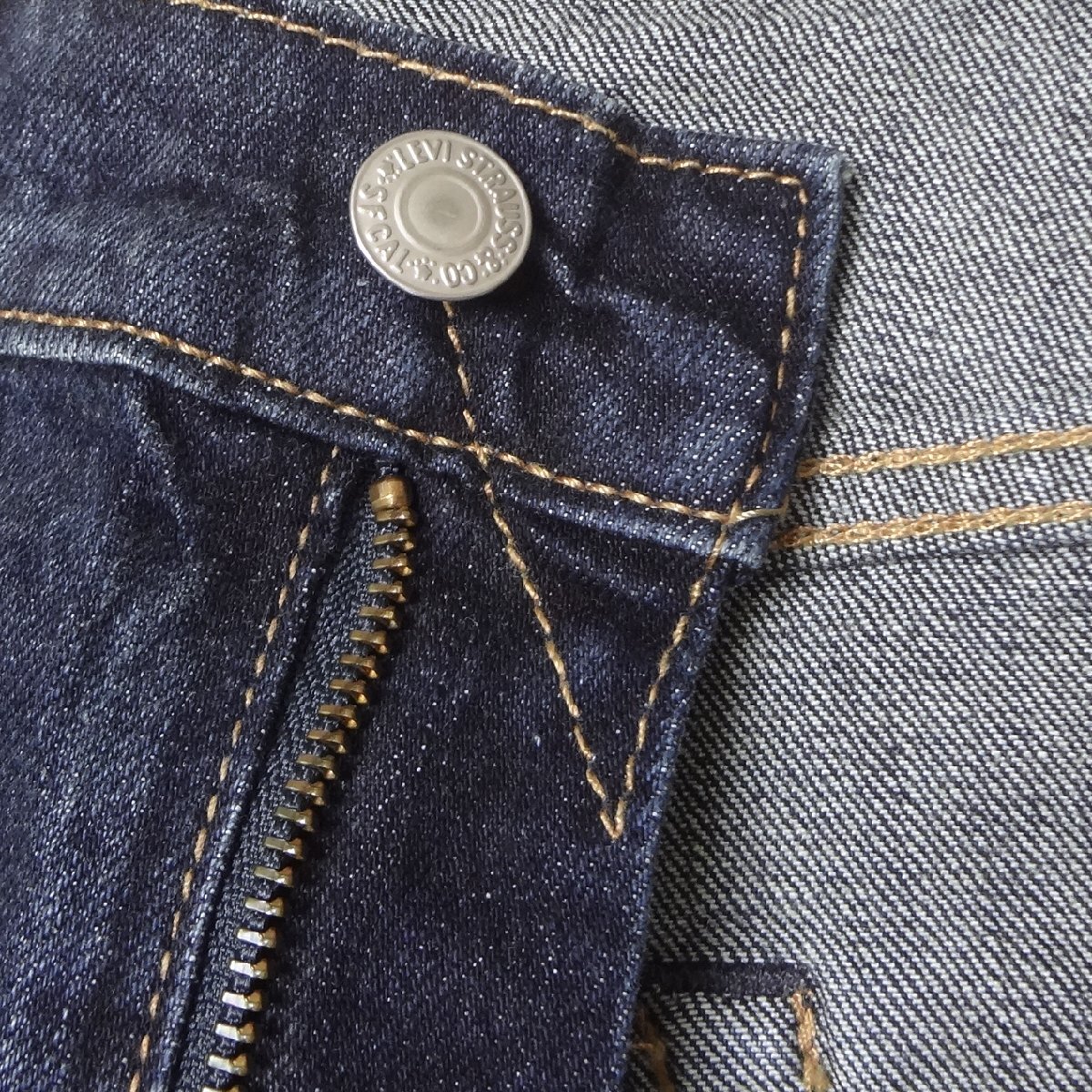 ・ビックEレッドタブ、フロントジッパー、アーキュエットステッチ、5ポケットリベット、レザーパッチ