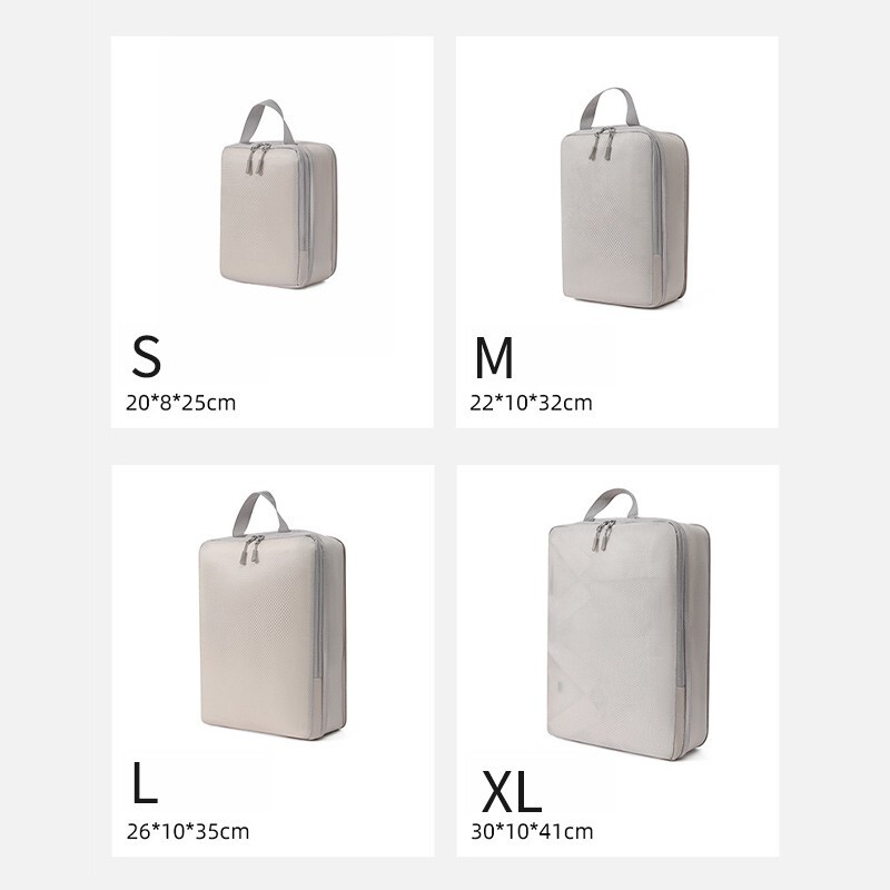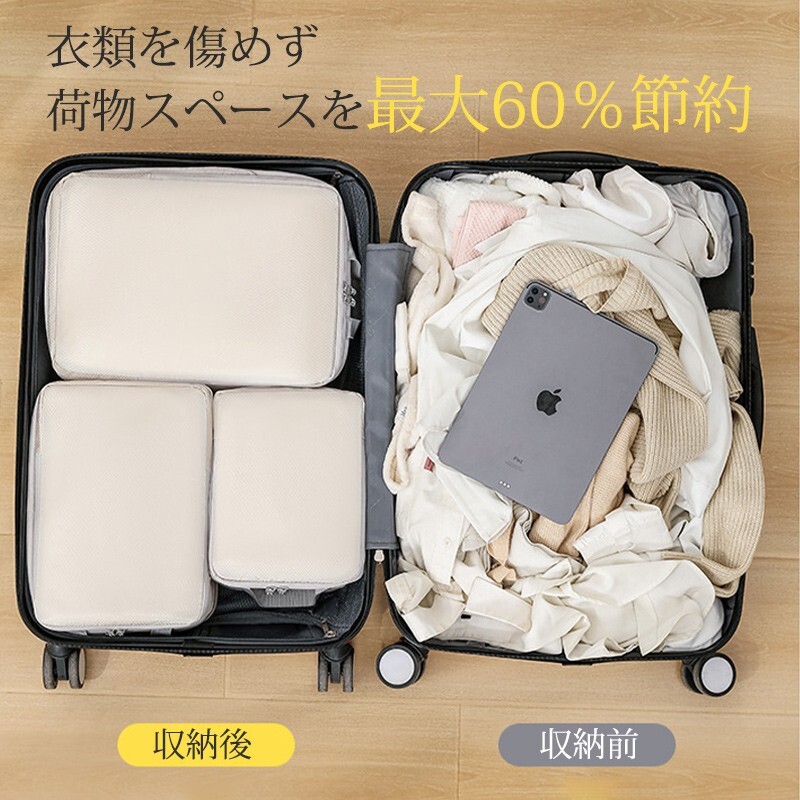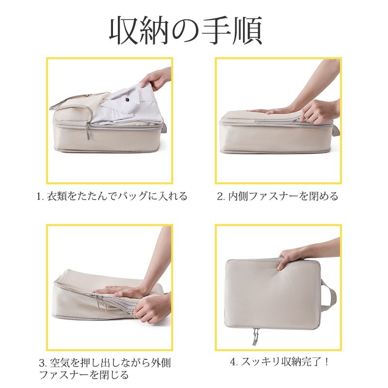 畳んだ衣類を収納し、ファスナーを閉めるだけで手軽に圧縮できる、安心のトラベルポーチ。