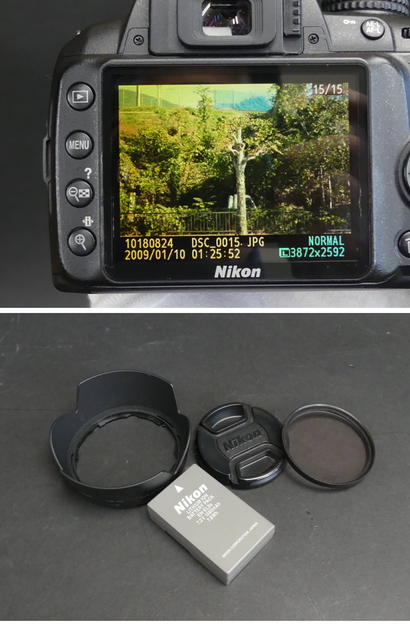 | ◇商品情報◇ | 当店の商品をご覧いただきありがとうございます!! Nikon ニコン D3000 レンズ DX AF-S 18-55mm 1:3.5-5.6 G VR 一眼レフ デジタル カメラ 訳あり 全体的に目立ったキズやひどい汚れなどはなく多少のスレや薄汚れ程度はございます。 訳ありとしてはモニターに黄ばみが発生していますのでジャンクとして 現状ではズーム/ズームアウト、セレクター切替、本体のボタン操作、フラッシュ発光、静止画の撮影と再生は行えました。 レンズは目視の限りでは目に付くカビは無くクリアですが微細なスレ、ホコリ程度はあります。 画像のバッテリーも付属しています(充電器はありません) (消耗品につきバッテリー寿命などはわかりません) 詳細な撮影動作、上記以外の詳細な動作、精度、状態チェック等は行っていません。 現状でのお譲りとなりますので点検整備等が必要な場合は落札者様にてご対応ください 付属、状態などは画像よりご確認、ご判断くださいませ。 ※目視チェックをしていますが、表記漏れや見落としや細かな擦れ・薄汚れなどがある場合もございますので予め画像をご確認の上でご入札をお願いいたします。 商品のトップ画像端に写っている茶筅はサイズ比較用の備品ですので付属はしません | ||||||||||||||||||||||||||||||