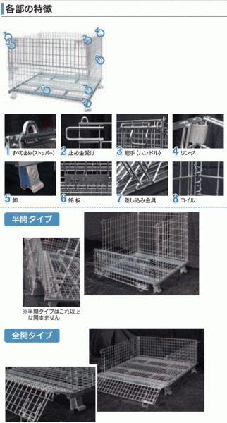 | 型式 | 荷重 (Kg) | 呼称寸法(mm) | 脚高 (mm) | 扉 | 線径 (mm) | 金網ピッチ (mm) | 自重 (kg) | 段積数 | ||