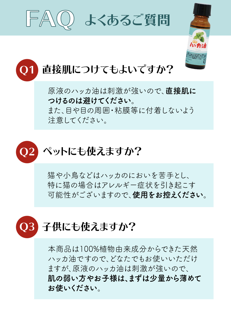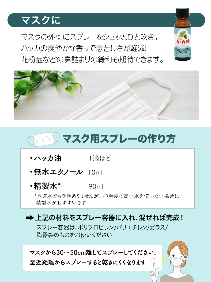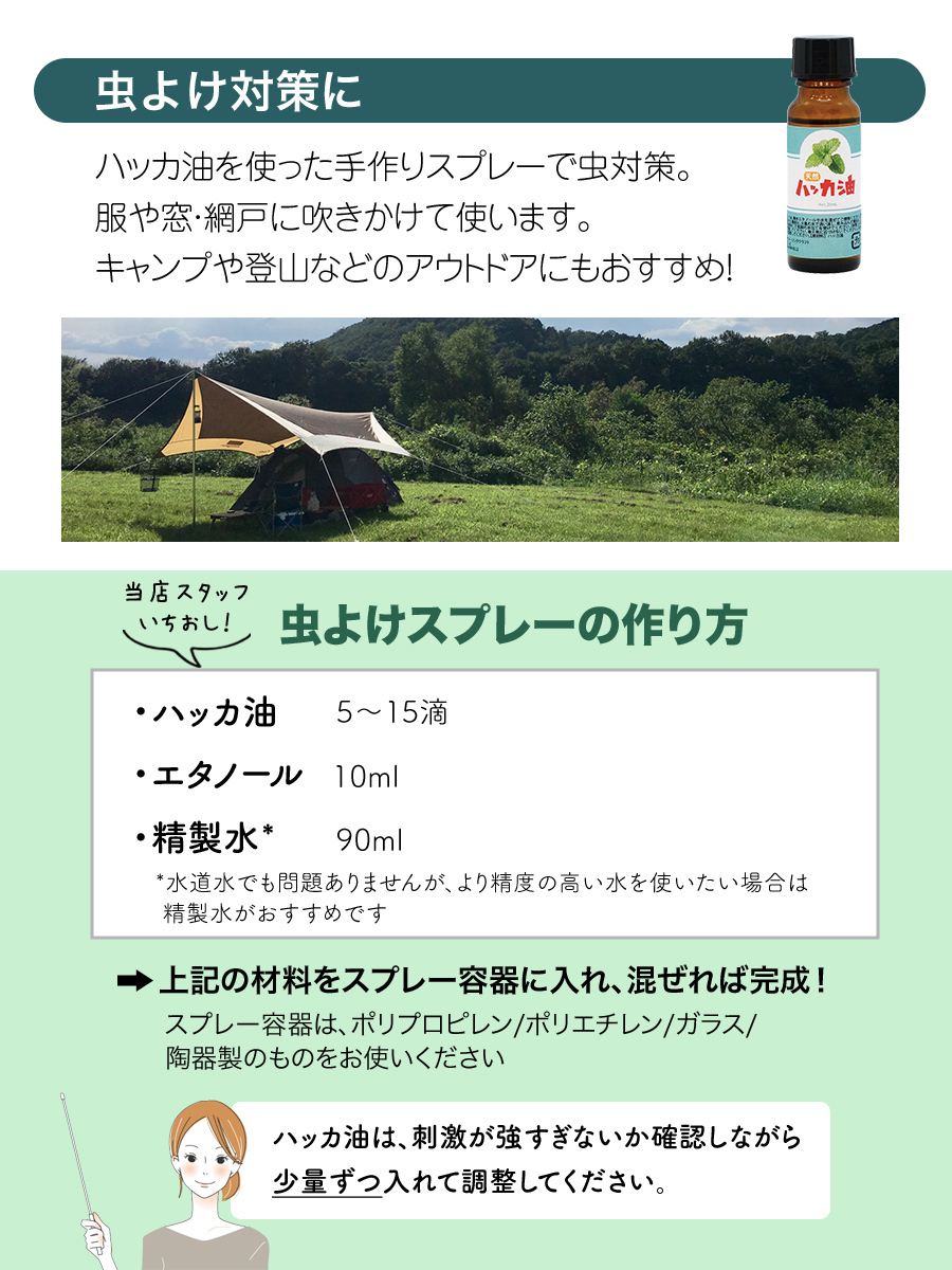 | 説明 | 日本製の天然ハッカ油20ml。 カバンやポケットに入れて持ち運びしやすい手のひらサイズ。 ハッカ油は、その特有の清涼感のある香りで、色々と便利に使える精油です。 例えば・・・ 手作り虫除けスプレーにして玄関・窓・網戸に散布したり、お風呂に数回スプレーして入浴剤にしたり、消臭剤にしたり、アロマオイルなど芳香用に使ったり 使い方次第で可能性の広がる、頼もしい精油です。 こちらの精油は、メントールを30%以上含有しています。 |