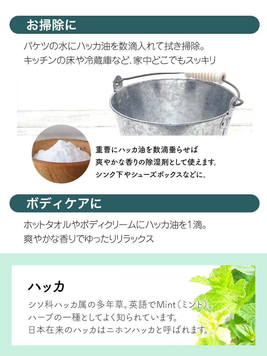 | 成分or素材or材質 | ハッカ 【学名】Mentha arvensis 【原産国】インド 【充填】日本 【抽出方法】水蒸気蒸留 【抽出部位】葉 |