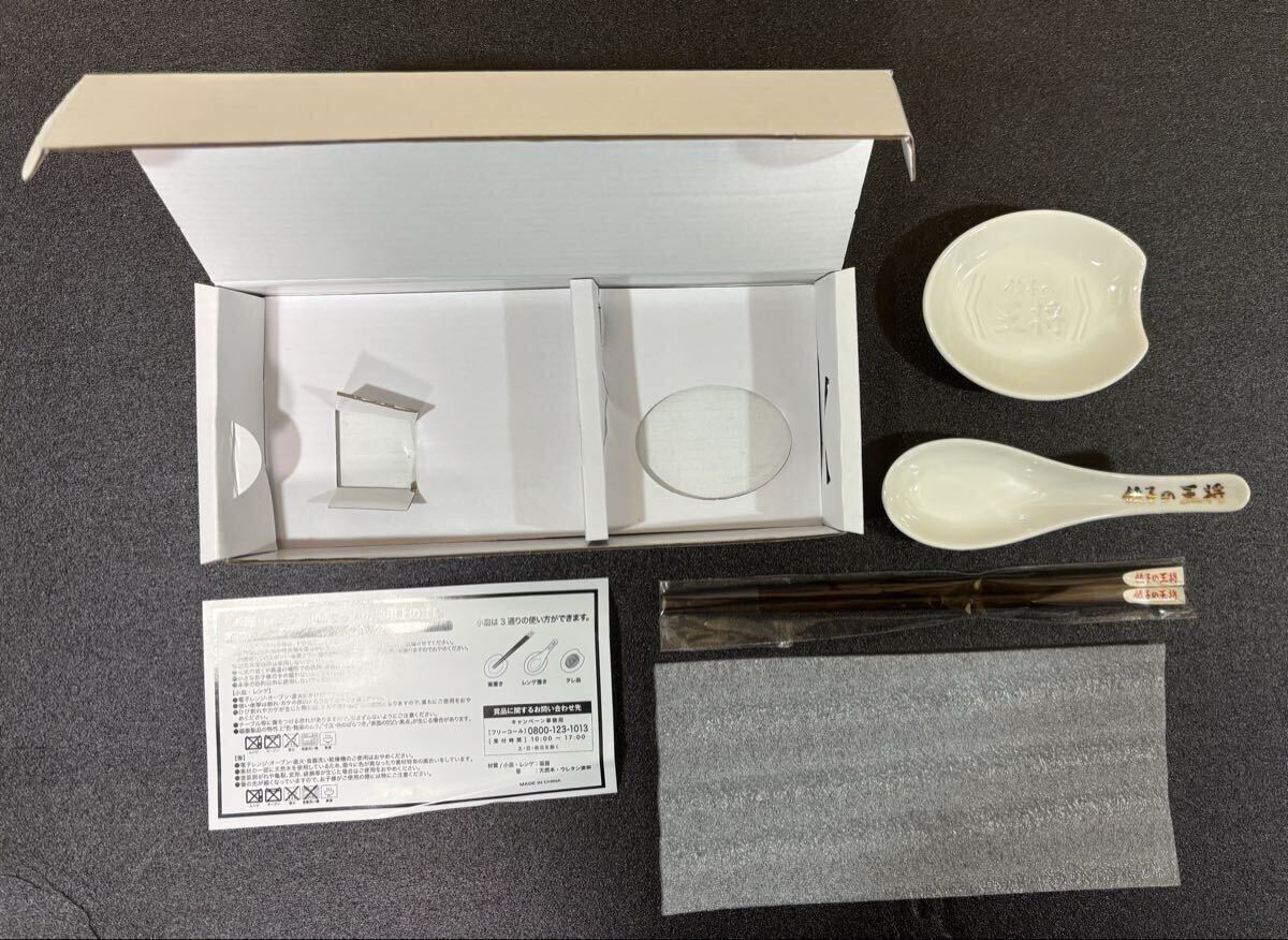 餃子の王将ぎょうざ倶楽部お客様感謝キャンペーンのお箸レンゲ小皿セットです。ノークレームノーリターンでお願い致します。神経質な方のご入札はご遠慮ください。