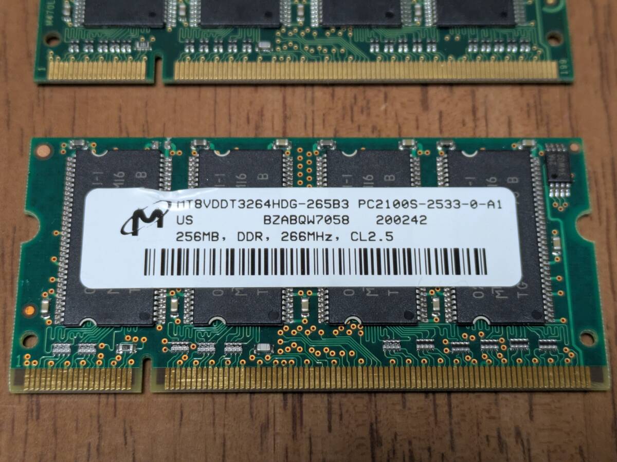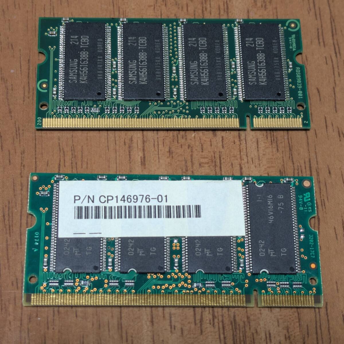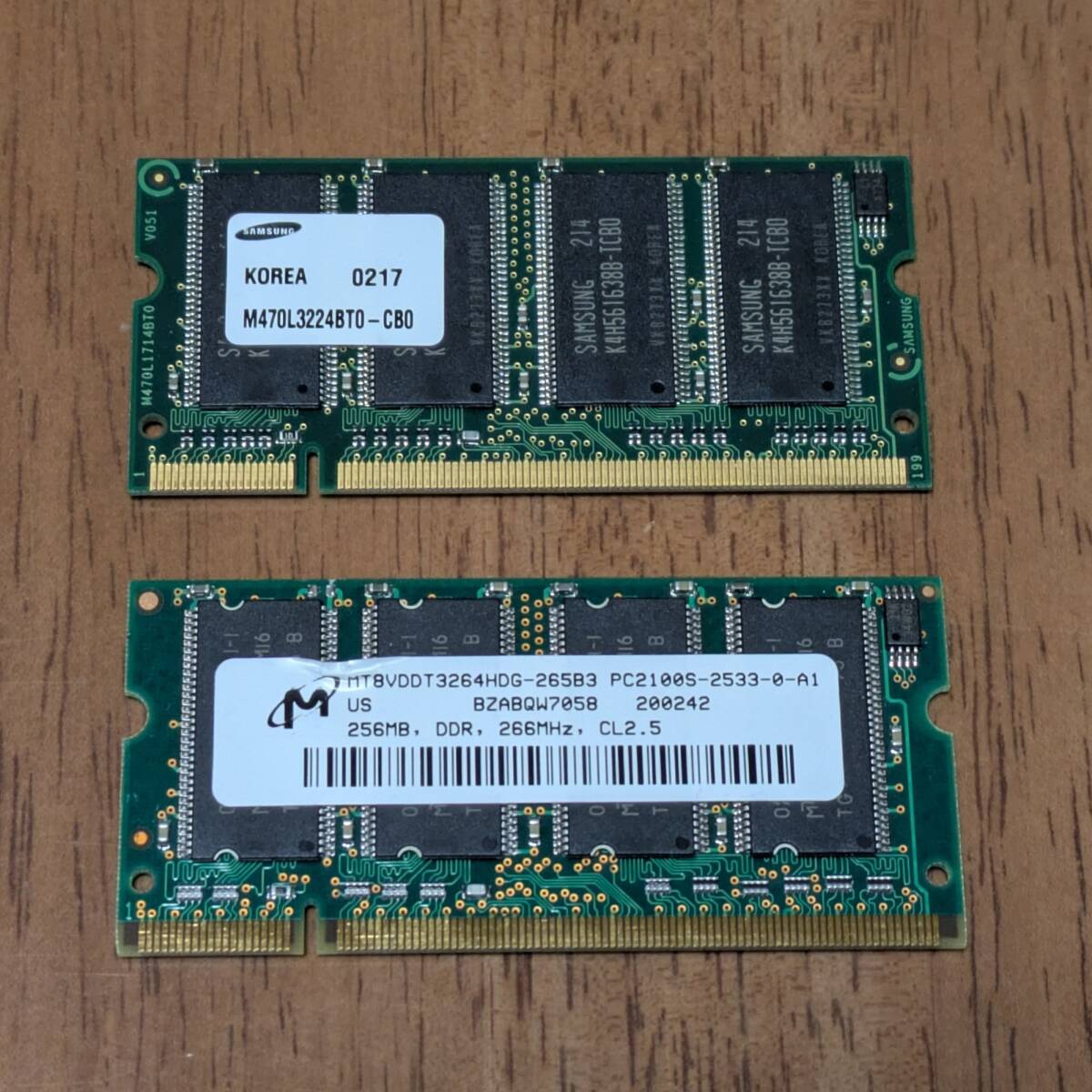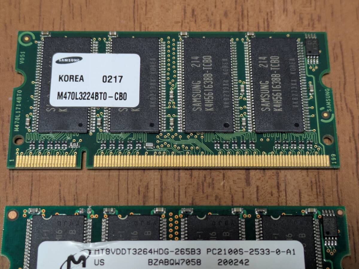 | ノートPC用メモリ・256M×1ともう一つは不明です。 約10年前まで問題なく使用していました。が、その後は使用しておらず動作確認はできておりません。 当方、PCに関して全く詳しくありません。キズ・汚れ等あります(写真を参照願います)。 | ||