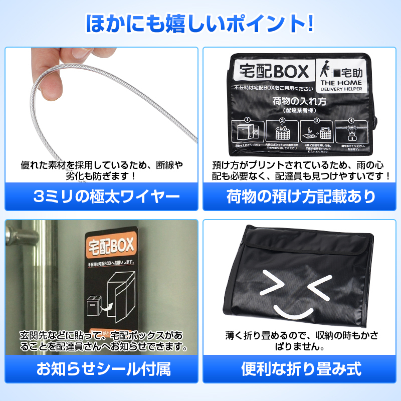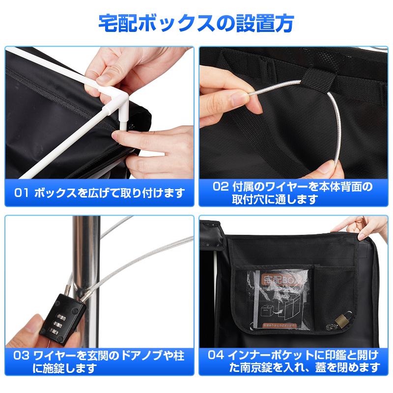 | 商品説明 | 不在でも在宅中でも荷物を簡単に受け取れ、時間を有効に活用できる。 各配送会社の段ボールがすっぽり収まるサイズです。 付属の南京錠とセキュリティーワイヤーで盜難を防止します。 水や汚れに強いPVC素材を使用しています。ジッパー部分も防水仕様で水が入る心配はありません。 印鑑や南京錠などの小物を収納可能です。見えやすいメッシュデザインもポイントです。 場所に合わせてパンと設置可能な3WAYデザイン 優れた素材を採用しているため、断線や劣化も防ぎます! 預け方がプリントされているため、雨の心配も必要なく、配達員も見つけやすいです! 玄関先などに貼って、宅配ボックスがあることを配達員さんへお知らせできます。 ※海外輸入品で輸送時の小傷等ある場合があります。 ※撮影とモニター環境により、実際の商品の色合いと多少異なる場合 もございますので、ご了承ください。 ※リサイクルにダンボールは再利用した物を使う場合があります。 取り付けサポート、説明書がございません。 |