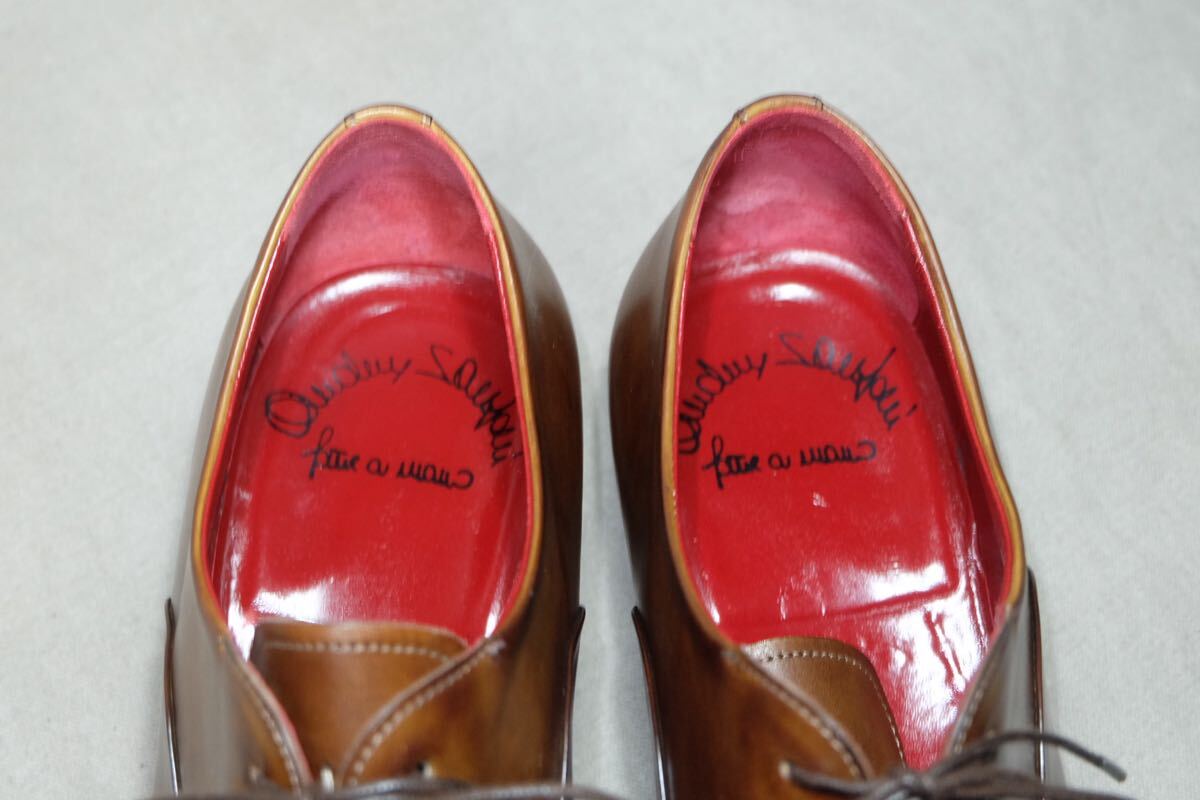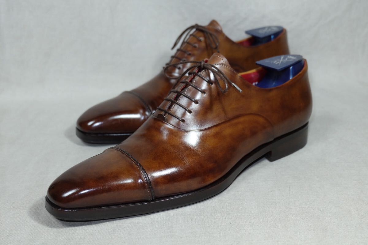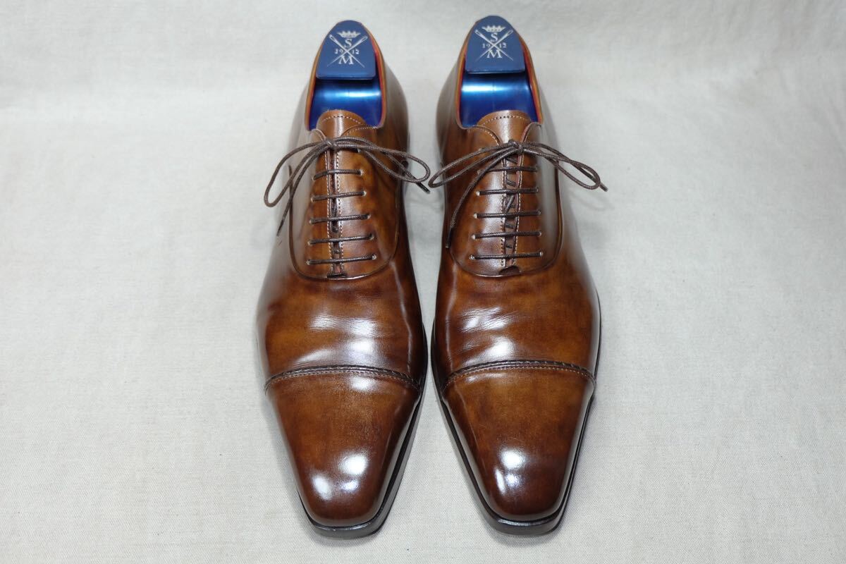 この度はアクセスありがとうございます。 ITALYの老舗高級ハンドメイドシューズメーカーSantoniの作り、デザイン、素材全てが選び抜かれたレースアップシューズになります。きめ細かく上質で艶のあるカーフレザーを贅沢に使用し、手染めによるパティーヌで絵画のように美しく息を飲むような上品な仕上がりとなっております。製法は返りが良く履き初めから軽く、修理も可能な丈夫な作りでもある伝統のマッケイ製法で、ソールもレザーソールを縫い目を隠すヒドゥンチャネル仕上げで製作されています。ここまでの作り込みをするためには、素材選びから製作過程まで繊細で熟練した技術が必要で、イタリアの歴史と技術の粋が詰まっており、美しく重厚なアートのような1足です。繊細なハンドメイド技術で贅沢に作り込まれた至高品ですので、この機会にぜひご検討よろしくお願いします。マグナーニ、ステファノブランキーニ、ベッタニン&ヴェントゥーリ、ハリス、シラバノラッタンジ、メッカリエロなどかお好きな方におすすめの一足です。 サイズ:UK8.5( 約27cm) 型:ストレートチップシューズ アウトソール:31.9cm ソール最大幅:10.5cm ソール:レザーソール 素材:カーフレザー カラー:ブラウンアンティーク 生産国:ITALY 状態:10段階中【8】 アッパー:永く使用いただける美品です。 ソール:永く使用いただける美品です。 付属品:なし 基本的にはノークレームノーリターンなのでご不明点等あればお気軽にご質問、ご連絡ください。 注意事項 確認はしておりますが、中古品のため小さなキズ、汚れ等を見落とす場合があるので神経質な方はご入札をお控えください。 サイズはあくまで標準的なサイズ感なので、実寸やメーカーサイズをご参考頂きますようお願いいたします。 三日以内にご連絡いただけない場合、評価の末再出品させていただきますのでご了承ください。 | |||