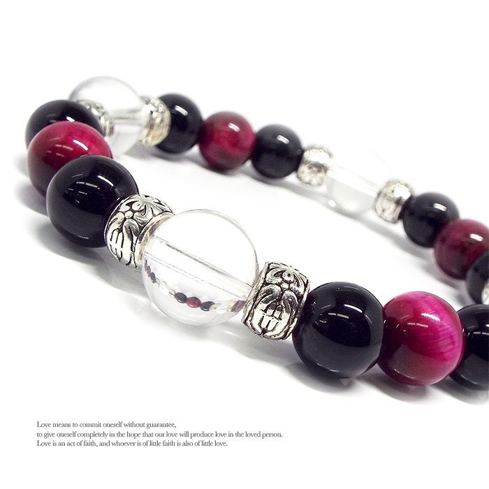 | 【STONE KITCHEN 天然石 パワーストーン】 水晶×オニキス×ピンクタイガーアイ☆天然石ブレスレット!!! オニキスとタイガーアイの組み合わせは、自制心や忍耐力を高め あらゆる障害を克服して目標達成へと導く効果があるといいます。 意志力と実行力をもたらす相性とされ 肝心な場面で冷静に行動できるように導いてくれるでしょう。 内周:約18cm サイズ:水晶 12mm ピンクタイガーアイ 10mm オニキス 10mm 1点 注意事項 ※金属部分は汗や汚れ等で変色する場合がございます。気になる場合は 金属磨きや布等で軽くふき取る事をおすすめします。 ※石の種類によっては、艶を引き出すことを目的として、ワックスや着色加工がされているものもあります。 ※表示のサイズは必ずしも最大値・最小値のサイズのものが入っているわけではございません。 ※天然石のため同じものでも色味・模様などが異なります。 ※照明の具合で実際とは色合いが異なる場合がございます。 また、天然素材特有のクラック・内包物を有する場合がございます。予めご了承下さい。 | |||