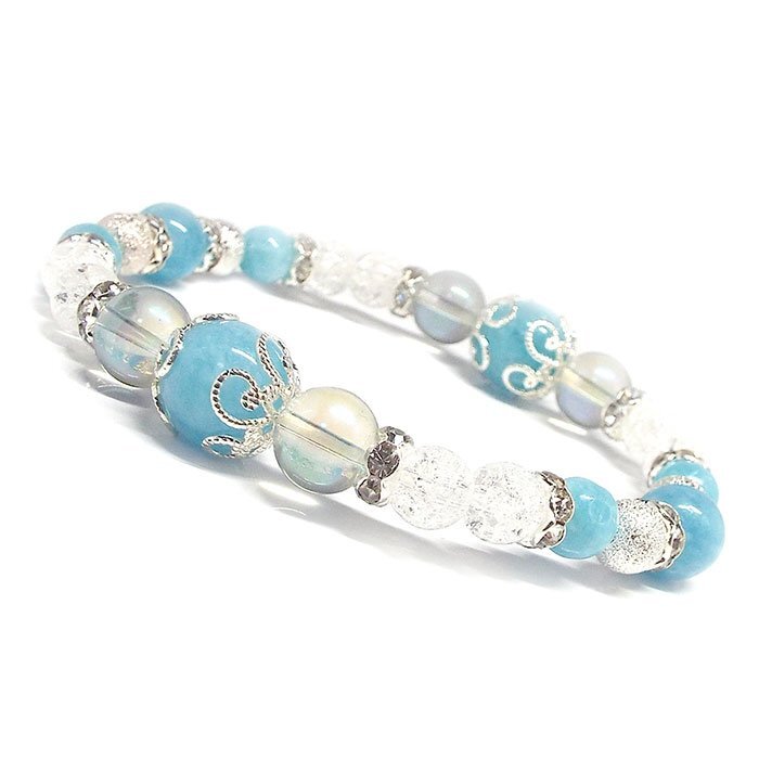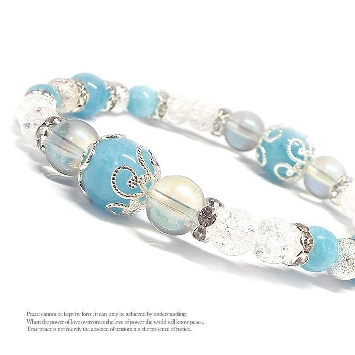 | 【STONE KITCHEN 天然石 パワーストーン】 透き通るような石の並びがとっても素敵☆ 大人気の雪の女王をモチーフにした愛と幸福が ぎゅっと詰まったブレスレットです♡ 可愛いパワーストーンブレスレットを身につけて、運気を押し上げちゃいましょう! ぐっと大人の女性に近づける・・・ そんな魔法をかけたようなモテカワブレスレットです♪ より大人の女性の魅力を引き出してくれるでしょう☆ いつも幼く見られがちな方や、大人の女性へ近づきたい方にオススメのアクセサリーです!!! 内周:約16cm サイズ:ブルークォーツ 10mm・8mm・6mm オーラ水晶 8mm クラック水晶 6mm 1点 注意事項 ※金属部分は汗や汚れ等で変色する場合がございます。気になる場合は 金属磨きや布等で軽くふき取る事をおすすめします。 ※石の種類によっては、艶を引き出すことを目的として、ワックスや着色加工がされているものもあります。 ※表示のサイズは必ずしも最大値・最小値のサイズのものが入っているわけではございません。 ※天然石のため同じものでも色味・模様などが異なります。 ※照明の具合で実際とは色合いが異なる場合がございます。 また、天然素材特有のクラック・内包物を有する場合がございます。予めご了承下さい。 | |
