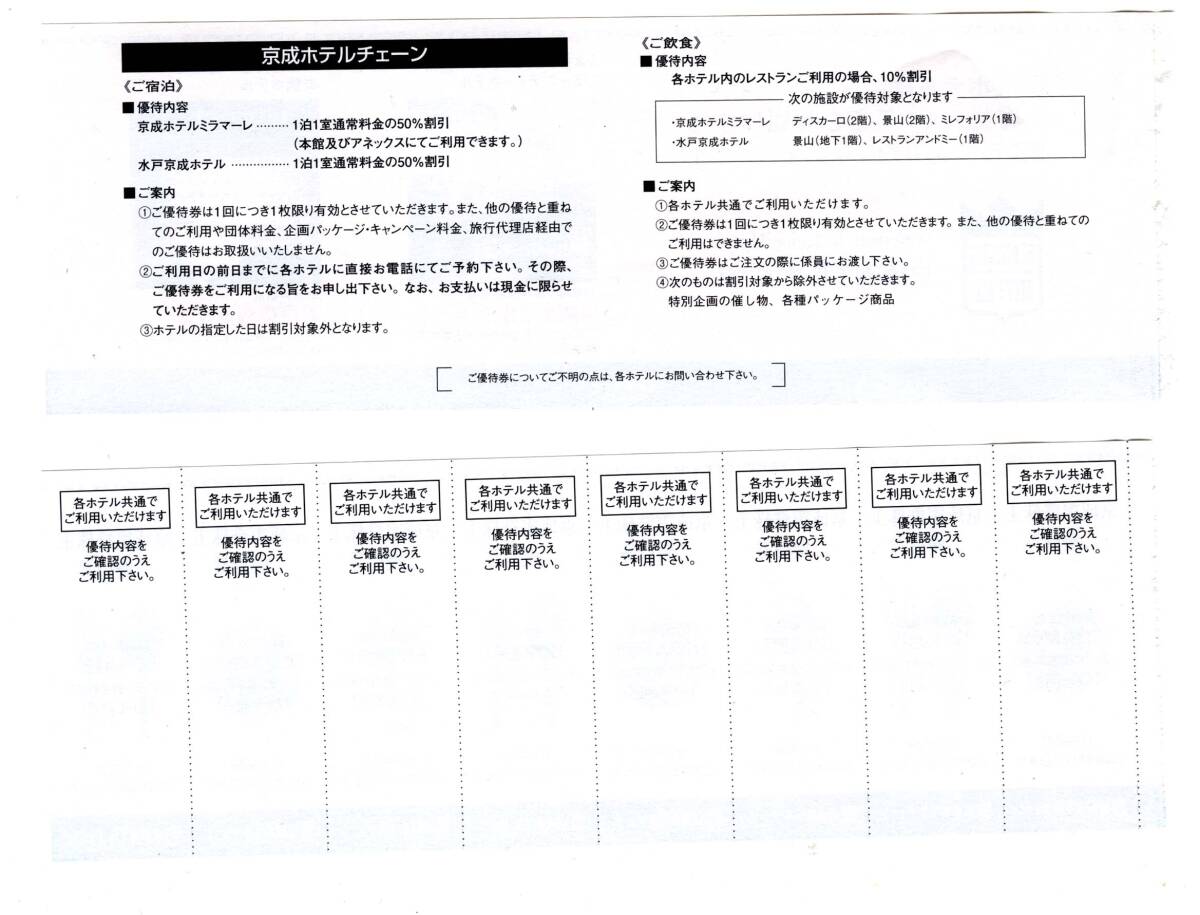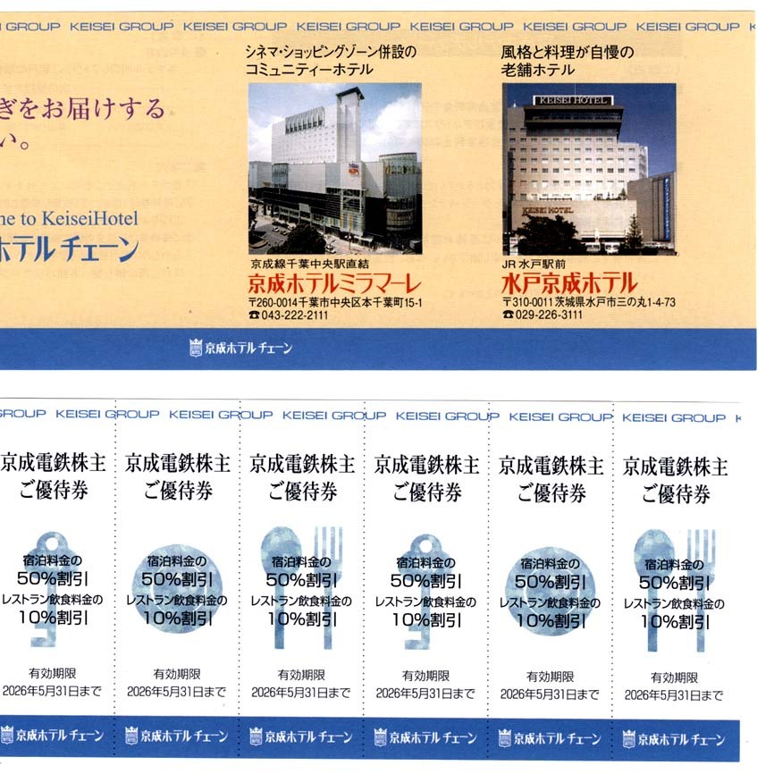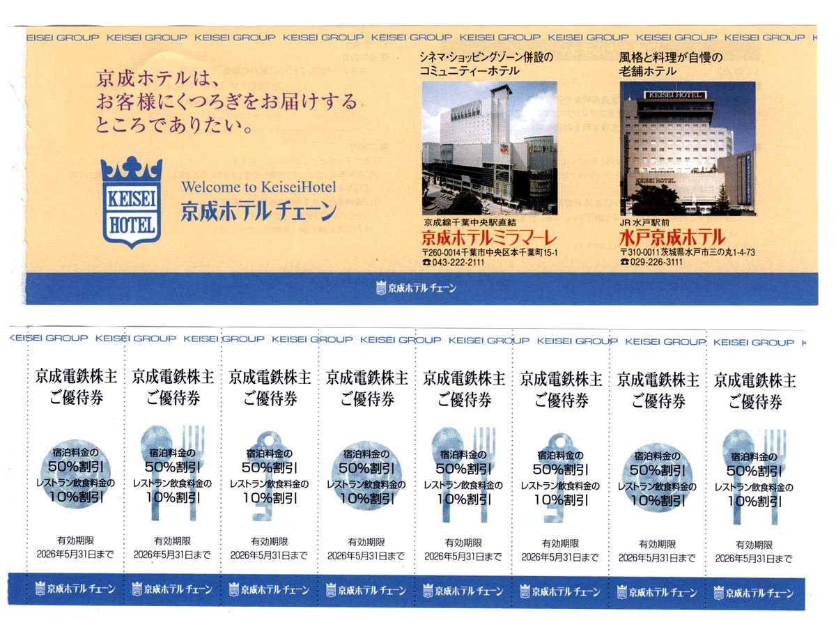 | 株主優待 京成ホテルミラマーレ 水戸京成ホテル 宿泊50%引 or レストラン飲食10%引 【8枚セット】 2026年5月31日まで ----------------------------------------- ■この商品は下記の配送方法に対応します。 複数落札や他商品と同梱の際は、その都度お見積もりします。 ●ゆうパケットポストmini(匿名配送) : 0円 (送料は出品者負担) ・配達日時や配達期限は指定できません ・配送日数 1週間~10日 ・受取人様宅の郵便受に配達(投函)されます。受領印は不要 ・住所不備や長期不在などで返送された場合、再送はヤマト運輸宅急便【着払い】のみ対応します(送料は落札者負担) ・紛失・破損等(初期不良が疑われる場合も含む)あっても補償はありません ・ビニール+厚紙包装します |