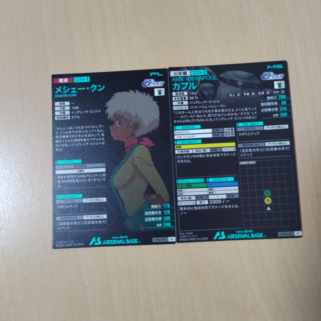 ガンダムアーセナルベース、Mレア、カプル&メシェー・クンの出品となります。未使用品です。排出後、スリーブに入れて保管していますが初期キズなど気になさる方はご遠慮ください。配送料金は梱包代込みで全国一律、120円とさせていただきます。他の出品との同梱は対応いたします。ノークレム、ノーリターンにてお願いいたします。