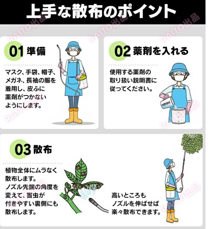 | 多目的な用途に対応 | 12L大容量を持つこのミストスプレーは、植物への水やり、雑草取り、芝生の肥料の供給、肥料や除草剤の散布、家や車の清掃、庭のスプリンクラーなど、さまざまな作業に使用することができます。あなたがプロの庭師であろうと初心者であろうと、この植物スプレーは、あなたが素晴らしい結果を得るのを助けることができる多目的なツールである。 |