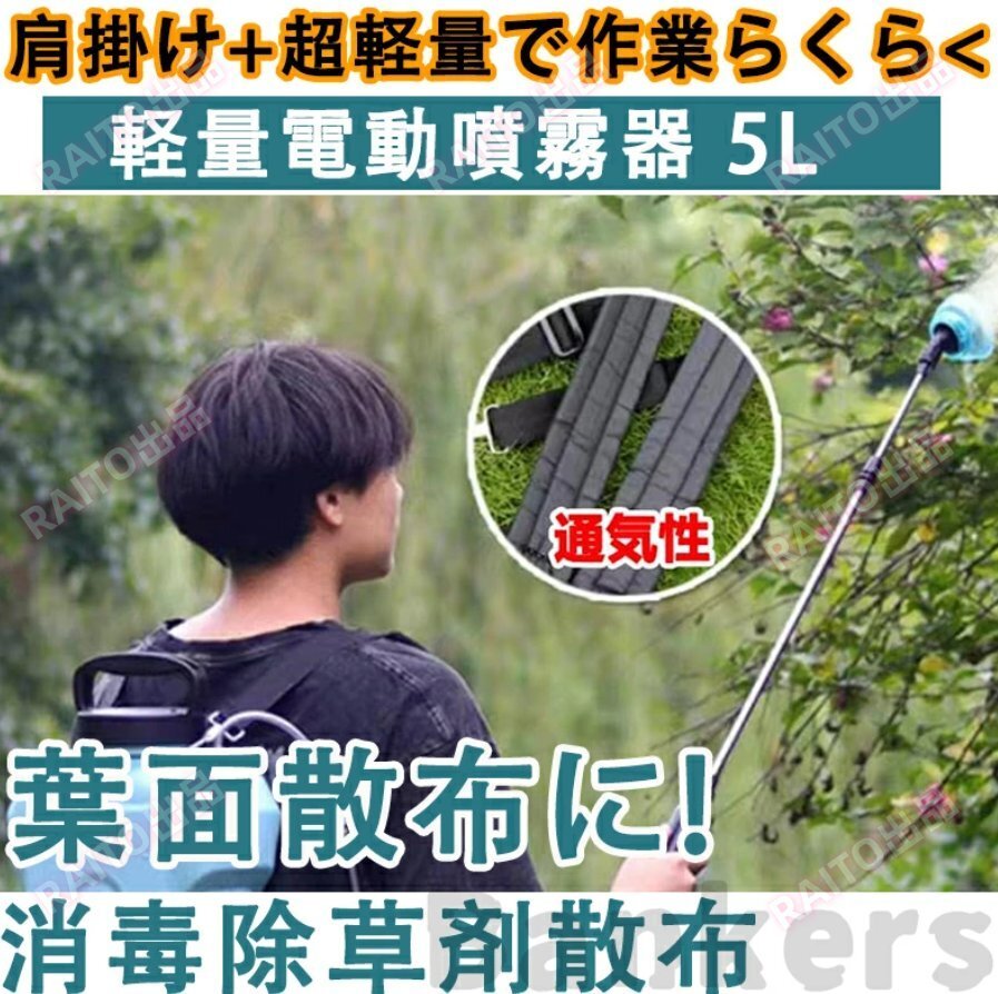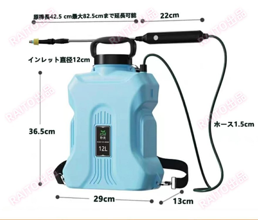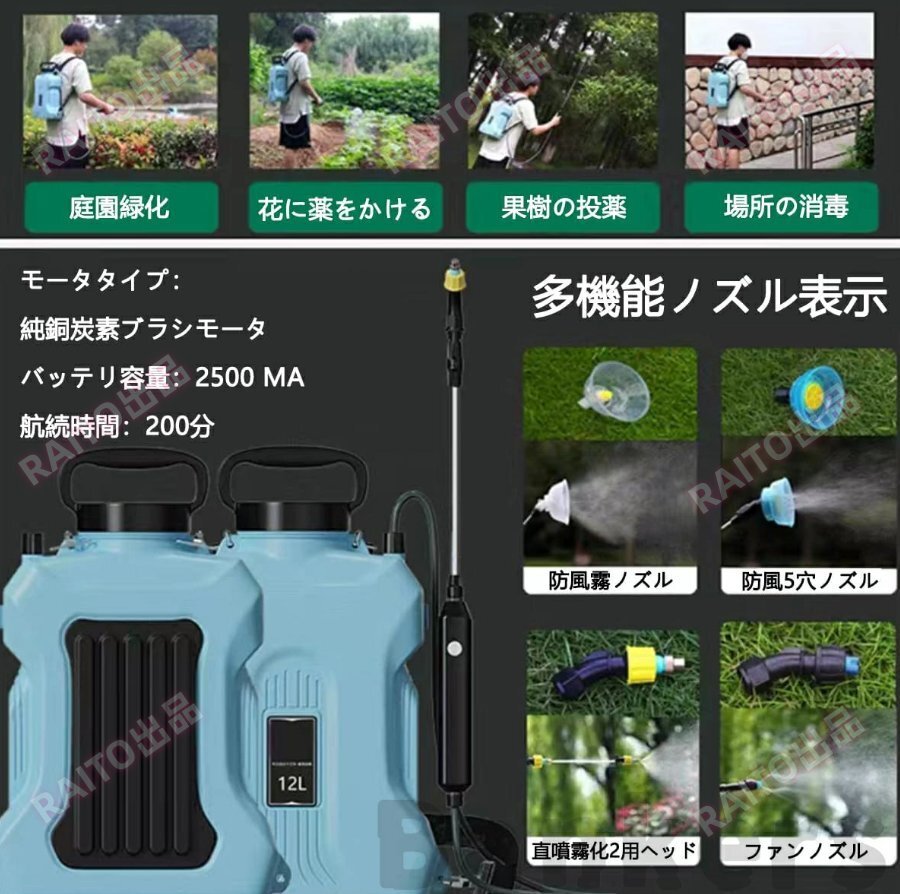| 作業量と効率性をアップ | 12L大容量タンクの全自動噴霧器として、手動式・蓄圧式に比べ、ボタンを押すだけで作業ができ、2500MAリチウムバッテリー付きで、長時間作業を支えます。これによって、負担軽減や時間短縮が実現し、大量や大面積の作業を素早く簡単に済めます。 |